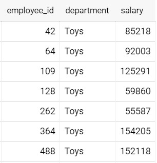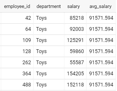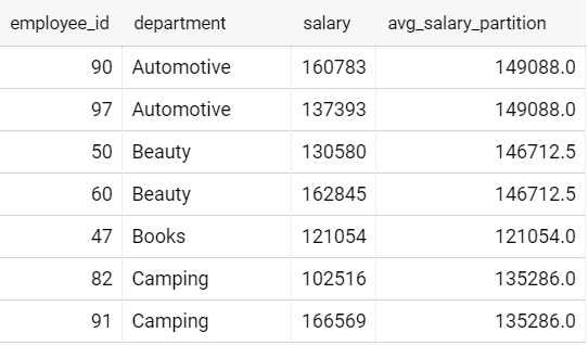 SELECT employee_id, department, salary, AVG(salary) OVER() AS avg_salary