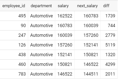 salary - LEAD(salary) OVER(PARTITION BY department ORDER BY salary desc) AS diff