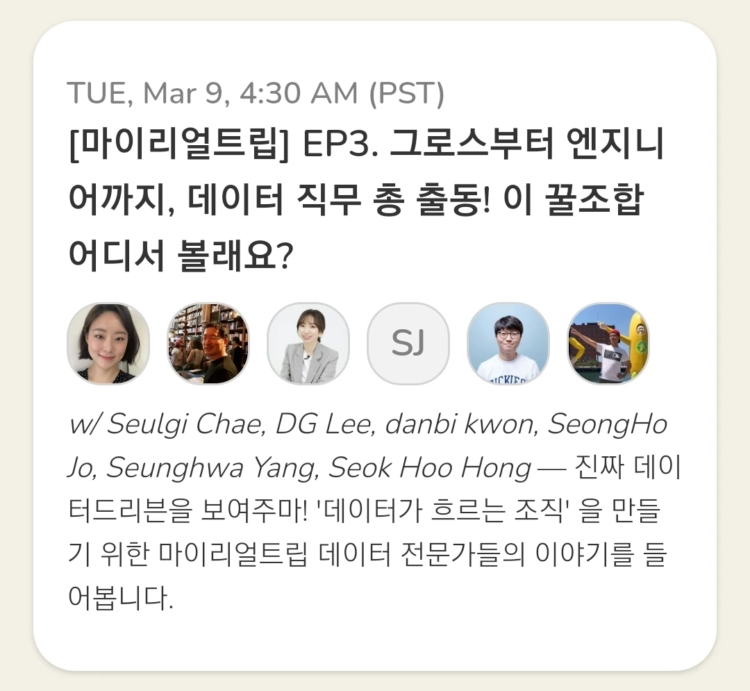 [마이리얼트립] EP3. 그로스부터 엔지니어까지, 데이터 직무 총 출동! 이 꿀조합 어디서 볼래요? Tuesday, March 9 at 9:30pm KST with Seulgi Chae, DG Lee, danbi kwon, SeongHo Jo, Seunghwa Yang, Seok Hoo Hong. 진짜 데이터드리븐을 보여주마! '데이터가 흐르는 조직' 을 만들기 위한 마이리얼트립 데이터 전문가들의 이