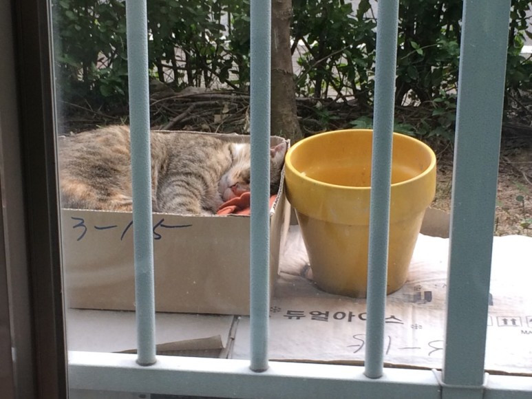 다른 아이들과 달리, 이 아이는 잠깐 쉬었다 가는 것이 아니라, 아예 여기 터를 잡은 듯해 보였다. 귀 한쪽이 잘린 것을 보니 중성화 수술을 마친 녀석이었다. 아마 중성화 후, 원래 구역에 다시 풀어준 것이 아니라, 아무 데나 풀어주는 바람에 낯선 남의 구역에서 눈치 보고 치이는 청소년 냥이로 짐작되었다. 아직 덜 자라 한눈에도 앳된 티가 나는 녀석이었다. 나고 자란 곳에서 정말 떨어진 낯선 곳에 혈혈단신 버려졌다고 상상해보니, 뭔가 맘이 짠해서 택배 박스에 못쓰는 옷을 깔아주니 들어가서 잘 잔다.