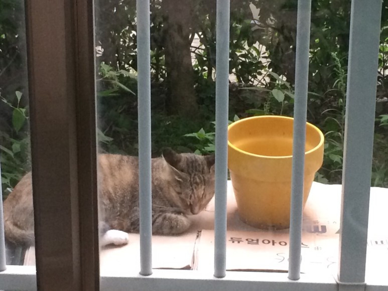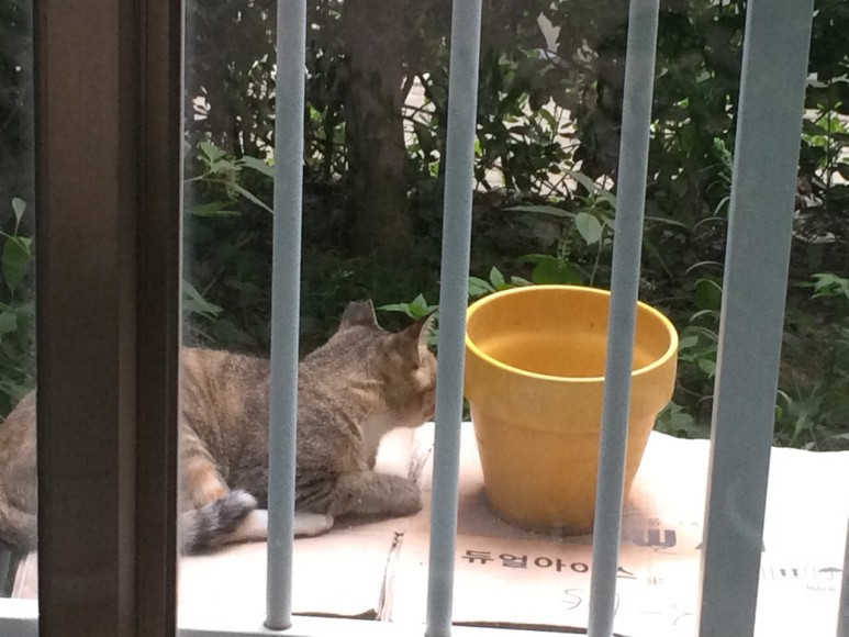 이웃들로부터 사생활 보호를 위해 관목으로 둘러싸인 우리 집 앞마당에는 햇빛이 비치는 시간에 맞춰 고양이들이 방문했다가 사라지곤 했다. 그런데 실외기 보호용으로 박스를 놔뒀더니, 어느 날 못 보던 얼굴이 나타났다. 원래도 사진을 못 찍지만, 고양이가 경계할 까 봐, 안방에서 베란다 밖을 찍은 사진들이라 끔찍한 것은 양해 부탁드린다.