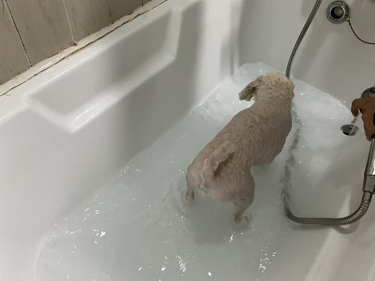 강아지에 피부는 약하니 강아지전용 샴푸를 샀다. 그다음에 해피를 살포시 욕조에 넣었다. “보통 소형견은 물을 싫어한다는데”