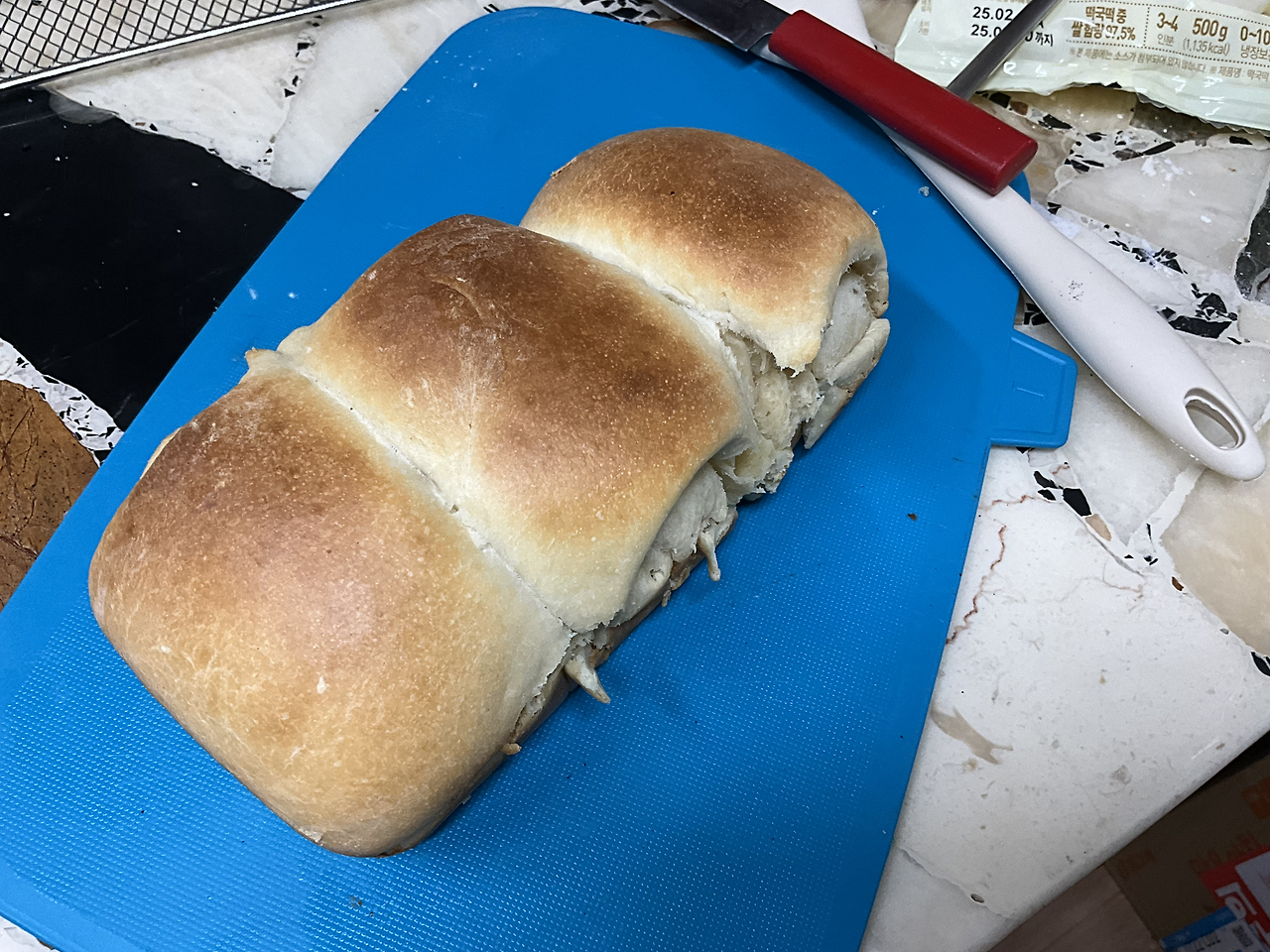 어????? 반죽이 안 부푼 것 같습니다. 뭐지? 이스트를 적게 넣었나? 일단 맛있게 나와도 내일 식빵은 한번 더 구워야겠습니다.