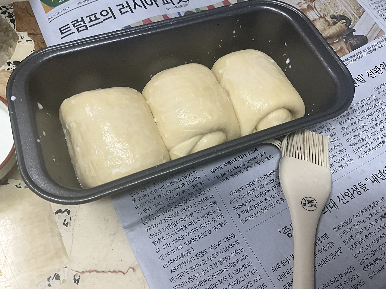 일단 구움색을 위해 우유를 바르고 예열을 시작합니다. 지금이 11시라 발효를 더 할 수도 없는 노릇입니다.