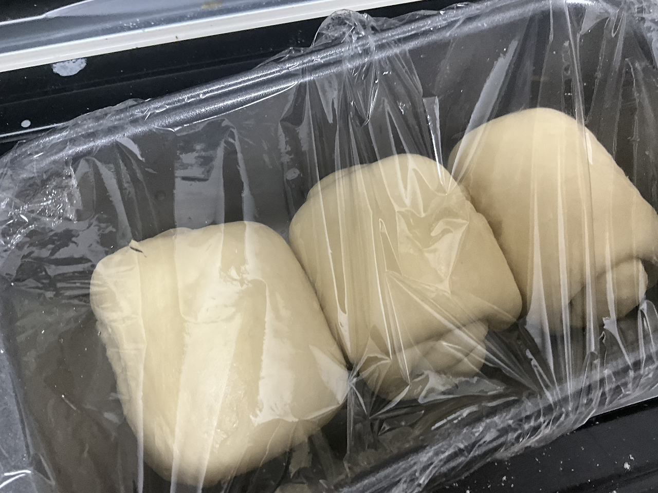 서론이 길었습니다. 발효가 끝난 빵의 모습은?!! 오… 잘 부푼 건가? 싶긴 하네요. 그래도 반죽을 들어보니 나름 발효가 잘 된 것 같습니다.