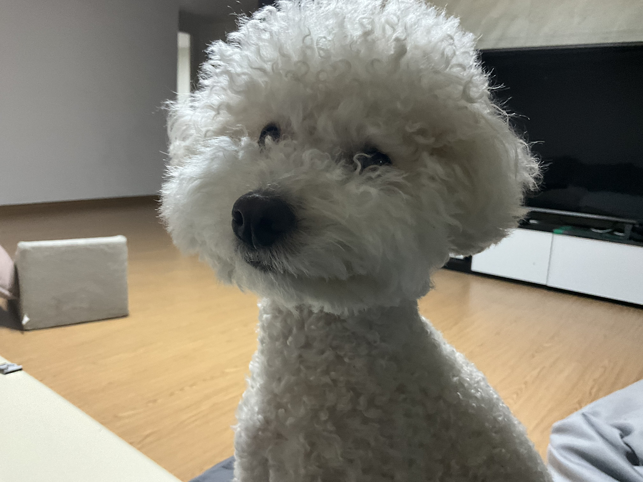 오! 잡생각 하는 사이 발효가 끝났습니다. 부엌으로 가려는 찰나 해피가 찾아오네요.
