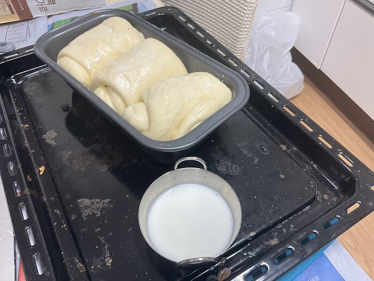어제보다 발효가 잘 된 것 같습니다. 이제 예열을 한 뒤 굽기만 하면 끝입니다.