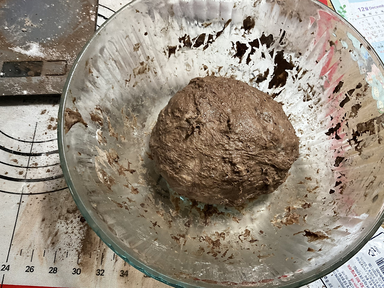 음.. 반죽이 살짝 묽습니다. 찾아보니 코코아 가루를 넣으면 대부분 반죽을 묽어지나 봅니다. 그다음 1차 발효 후 둥글리기, 성형을 해줍니다.