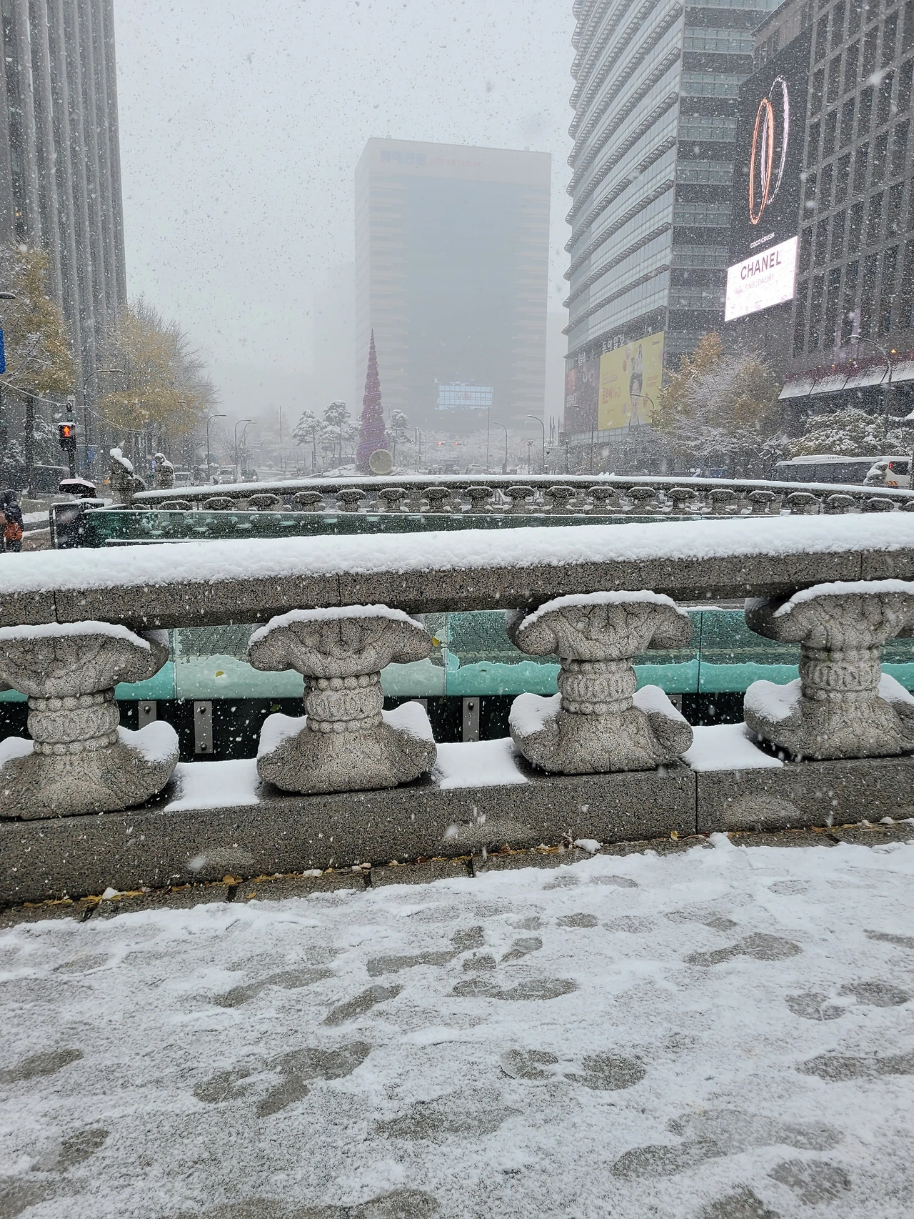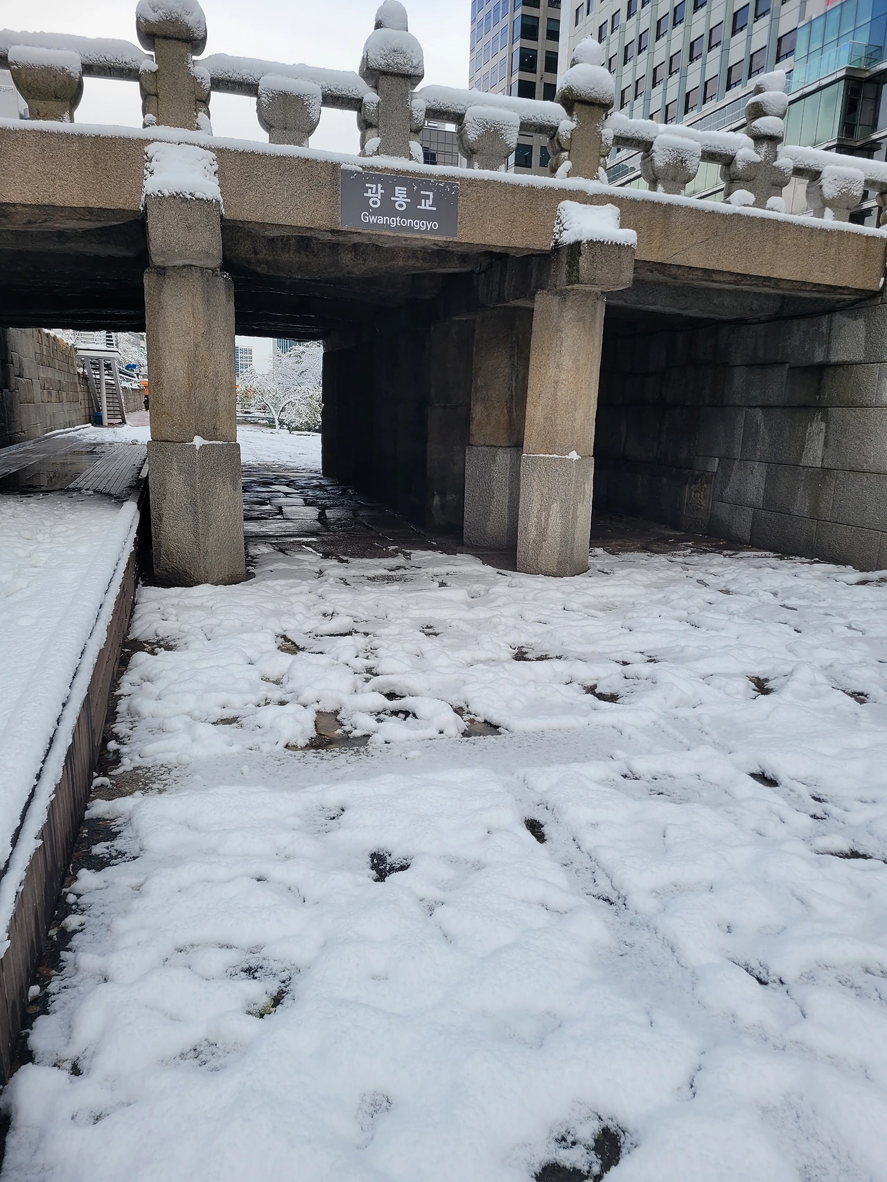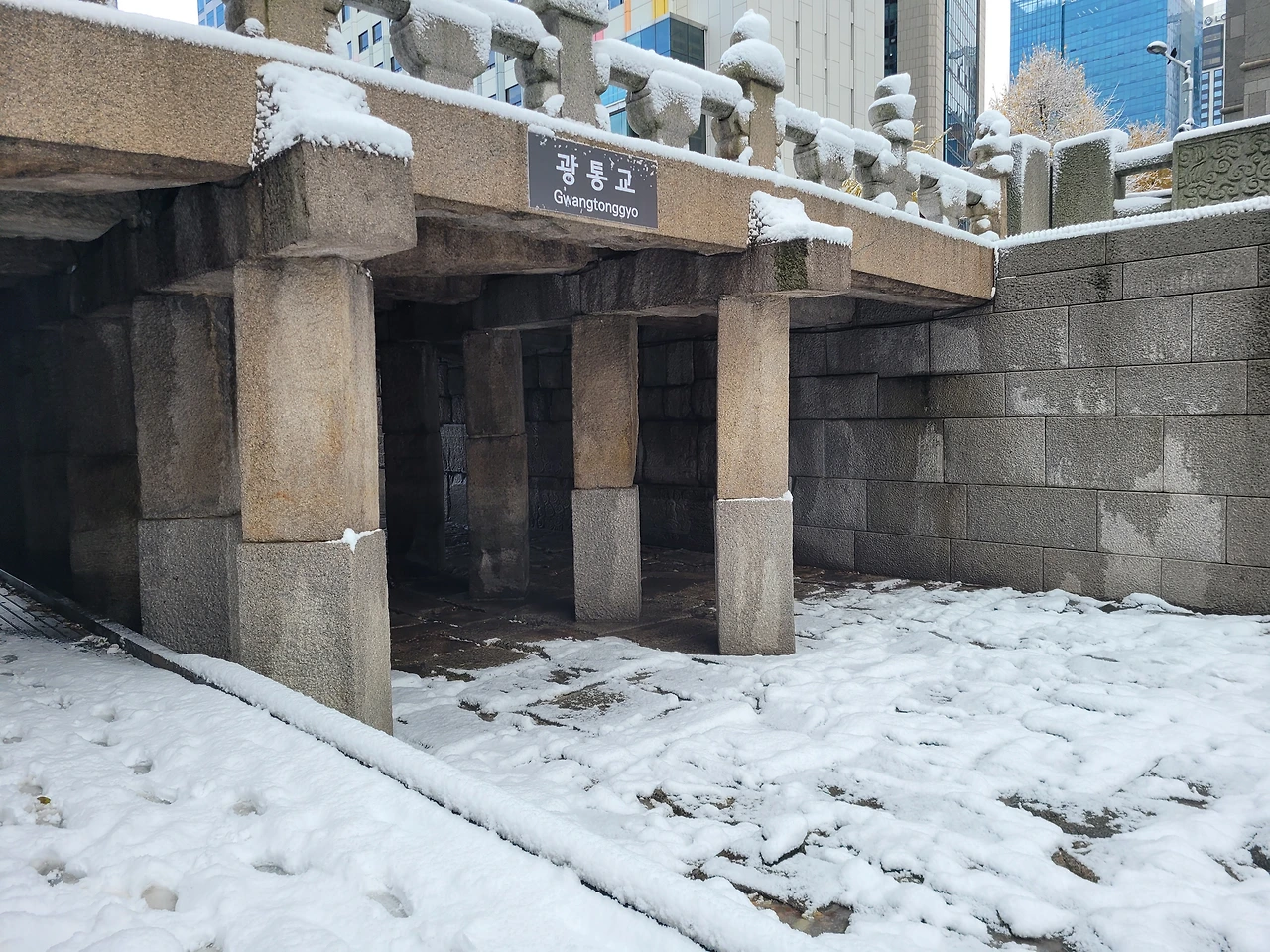 끝으로 설산에 우뚝 솟은 남산타워를 휴대폰에 담고, 덕수궁 대한문이 있는 시청역에서부터 환구단, 청계천 모전교, 광통교, 장통교를 지나 수표교까지 눈 내리는 한양나들이는 을지로 3가에서 멈췄다.