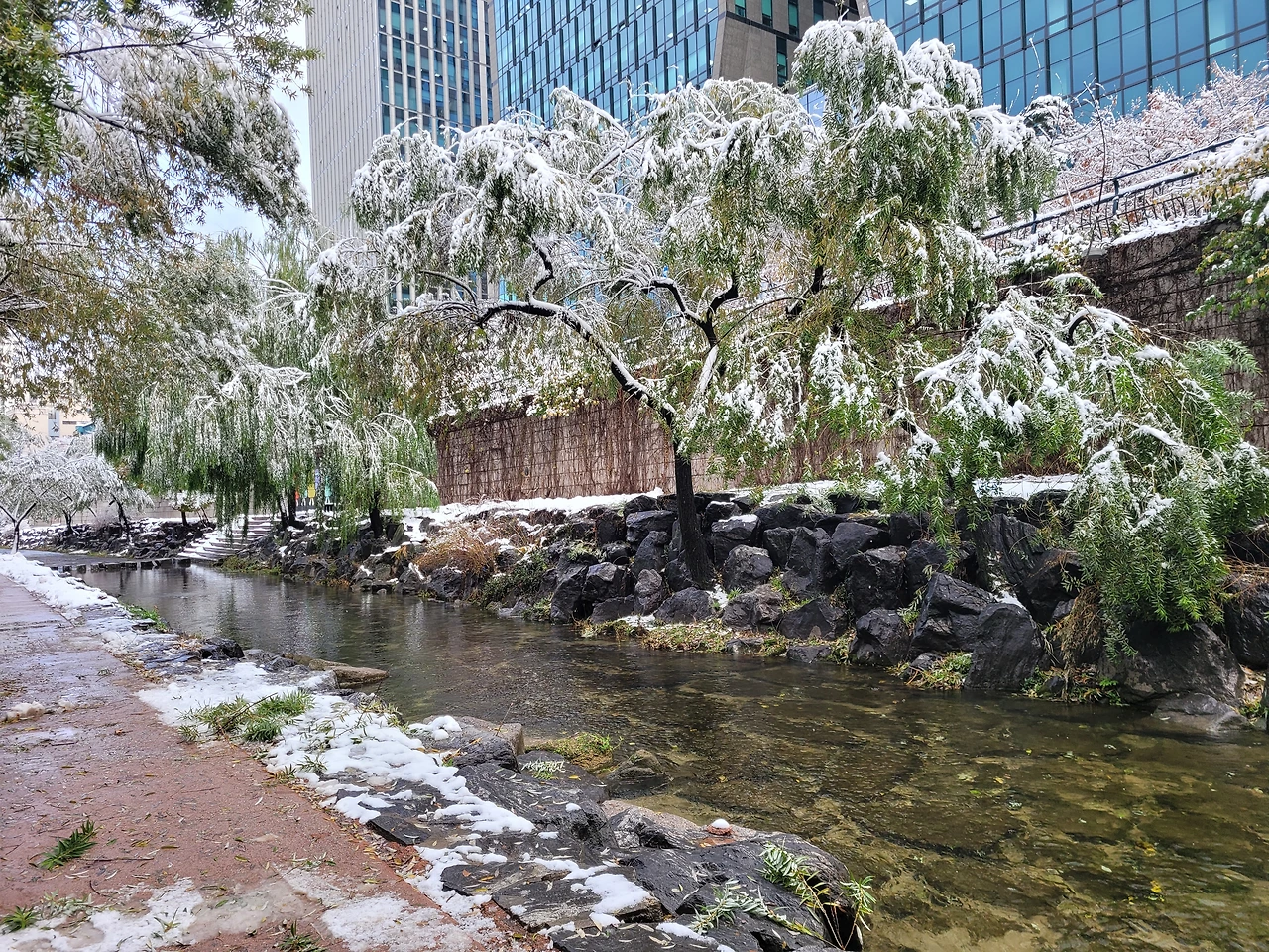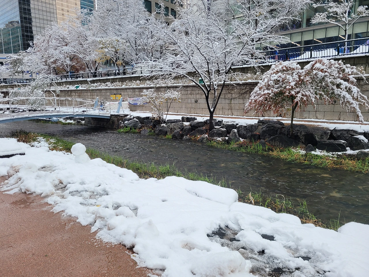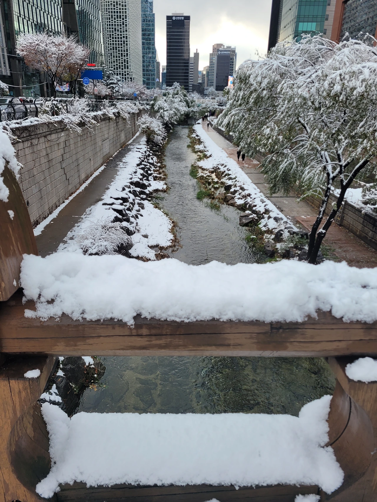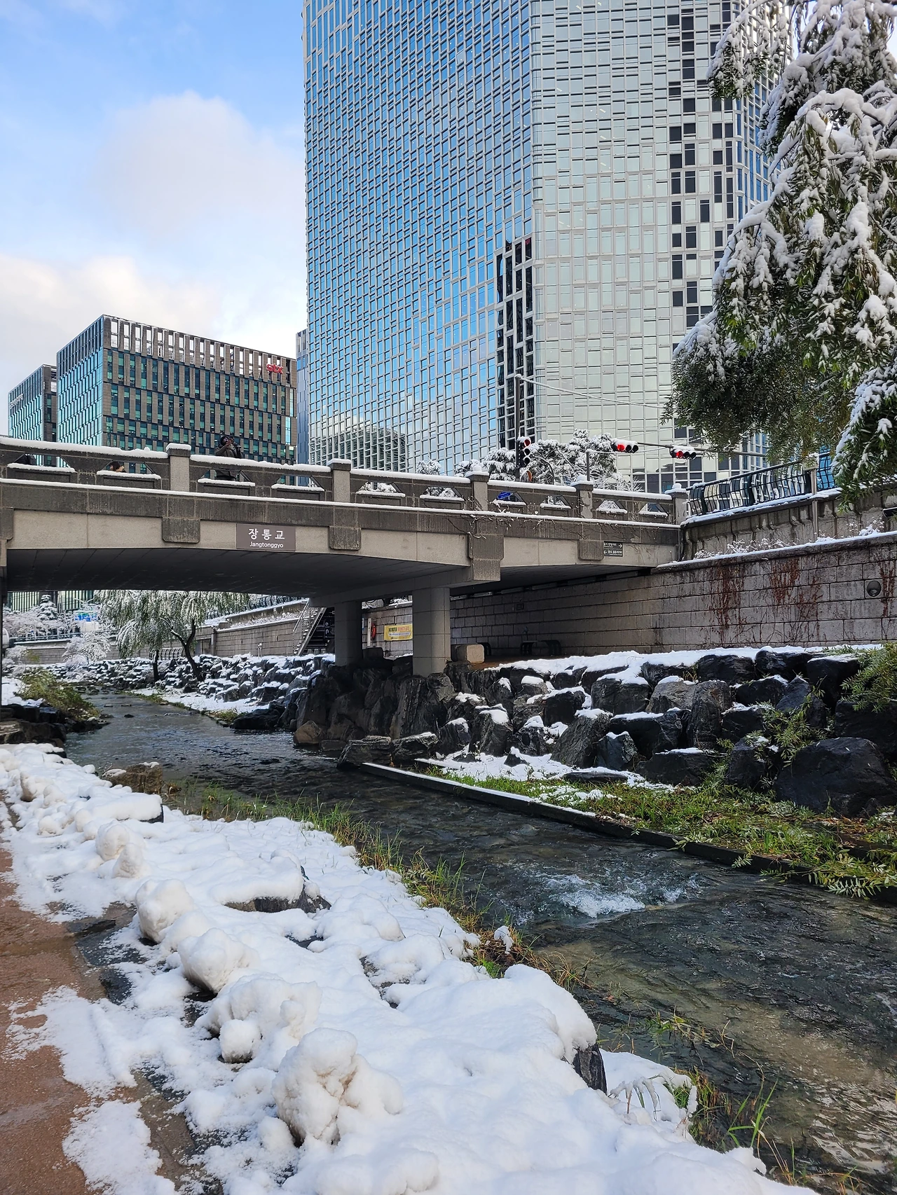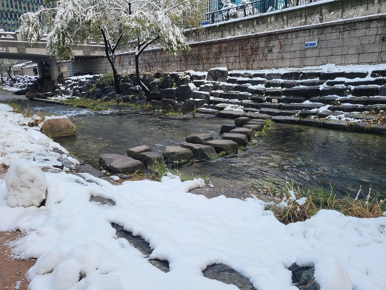 한 시간쯤 지나서 눈발이 조금씩 약해져서 본격적으로 청계천을 걷기로 했다.
