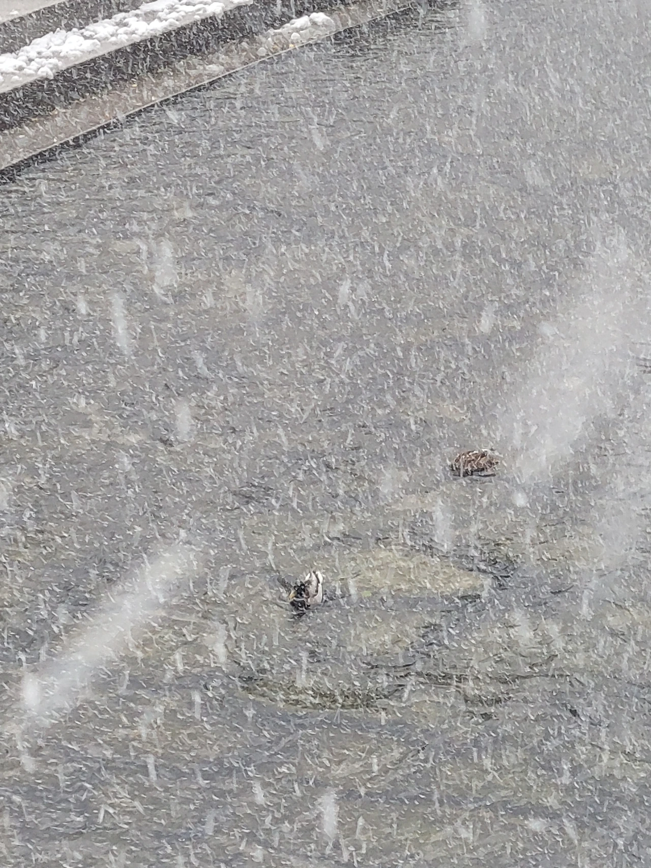 내리는 눈 때문에 사진에 잘 담기지 않았지만, 자세히 보면 두 마리의 청둥오리가 있었다.