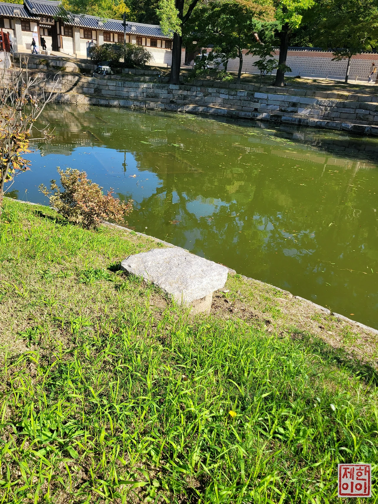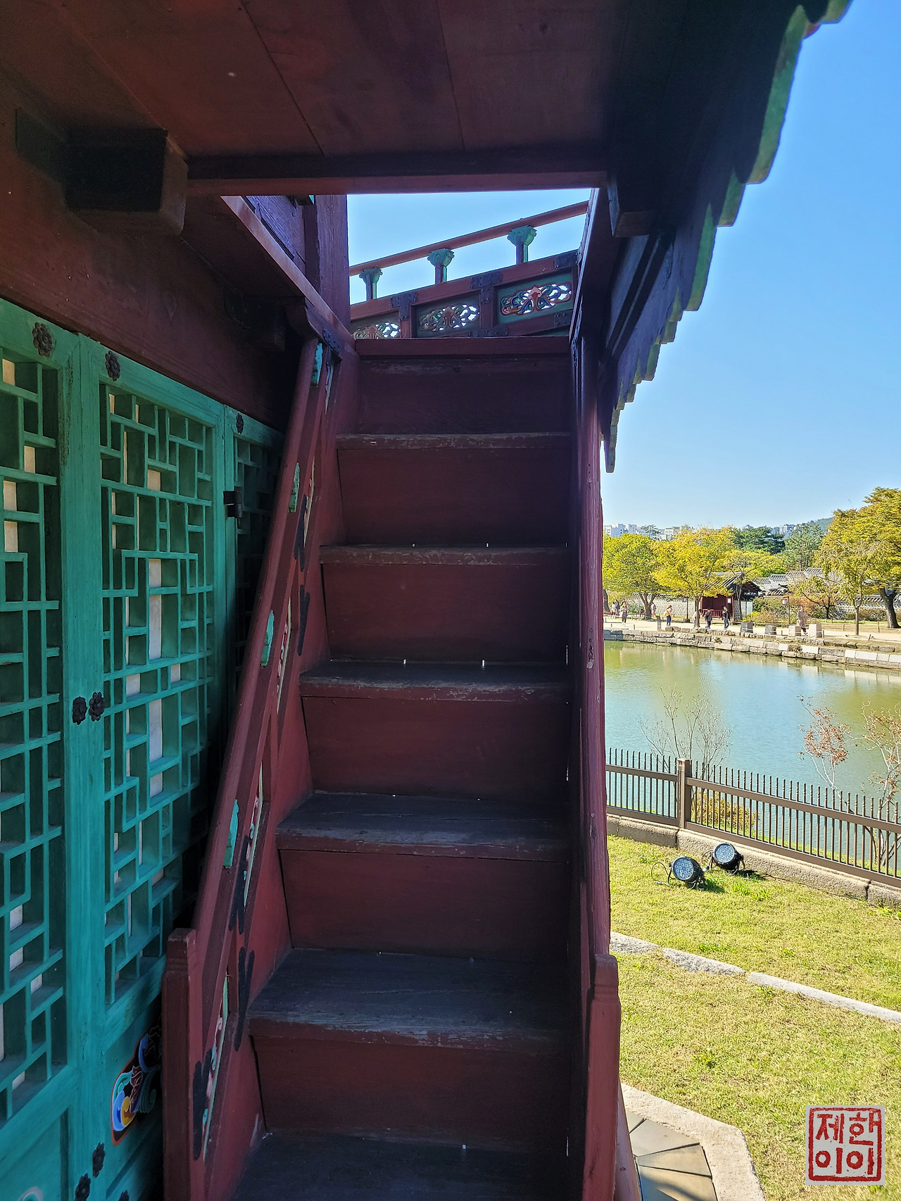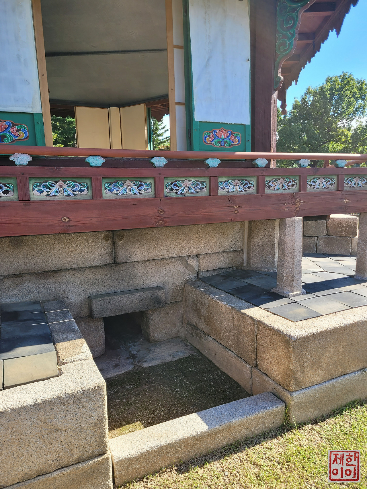 처음 향원정이 복원되었을 때 다리가 놓였던 흔적이 있는 계단이다. 계단 위로 다리가 일자로 놓였었는데, 그것을 다시 원래의 위치로 복원한 게 지금의 모습이다. 그리고 이 계단은 배를 타기 위한 계단이었다고 한다.