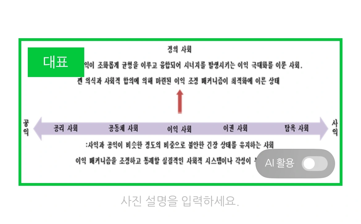 우선 이익 사회를 정의하자면, 공익(共益)과 사익(私益)이 고루 존재하는 중간 단계인 이익 사회는 공익(共益)과 사익(私益) 추구의 편향 정도에 따라 양 극단이 공리 사회와 탐욕 사회로 대별된다. 그 중간 점이 지대에 잠정적 형태로 각각 공익과 사익 수호에 보다 더 집중하는 방어적 이익 사회(공동체사회)와 공격적 이익 사회(이권 사회)가 존재한다. 하지만 가장 바람직한 사회의 형태는 공익과 사익이 조화롭게 균형을 이루고, 공정한 경쟁을 통한 부와 권력의 합리적인 분배 및 역할의 안배가 보장되는 이상 사회로서의 정의 사회이다. 그리고 정의 사회는 생산적 경쟁과 배분을 가능케 하는 환경, 능력과 노력에 따른 개인의 차이와 기회 균등의 자유를 제도적으로 보장함은 물론, 공공선과 공공 복지를 수호하는 튼튼한 사회 안전망 및 사회 경제 정의를 지속 가능하게 하는 원숙한 형태의 조화와 협력의 생태계를 특징으로 갖는다.[1]