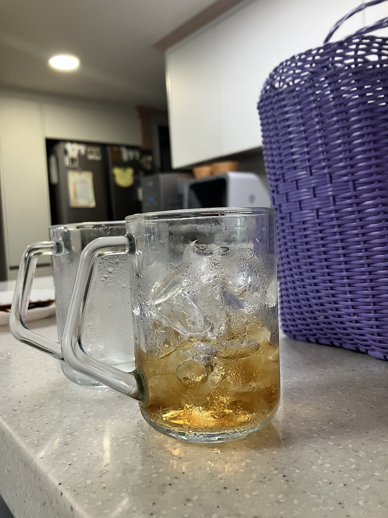 얼음물에. 커피를 타거나. 보리차를 마신다.