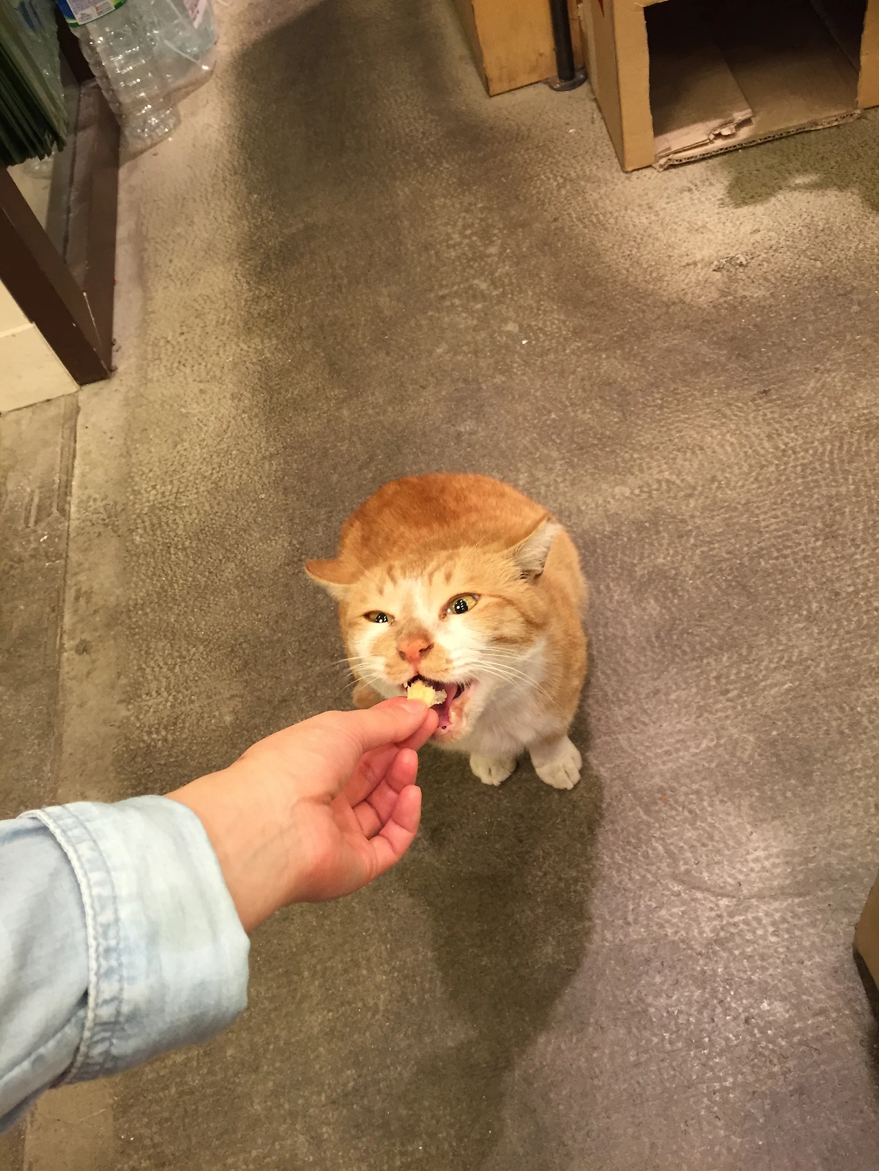 웃음이 나와서 빵 한 조각을 떼어주었다.