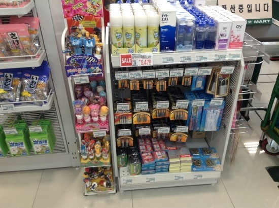 건전지, 세정제, 간단한 먹을거리 등을 배치하여 고객에게 '빠뜨린 것 같으니 고르세요' 라고 유혹한다.