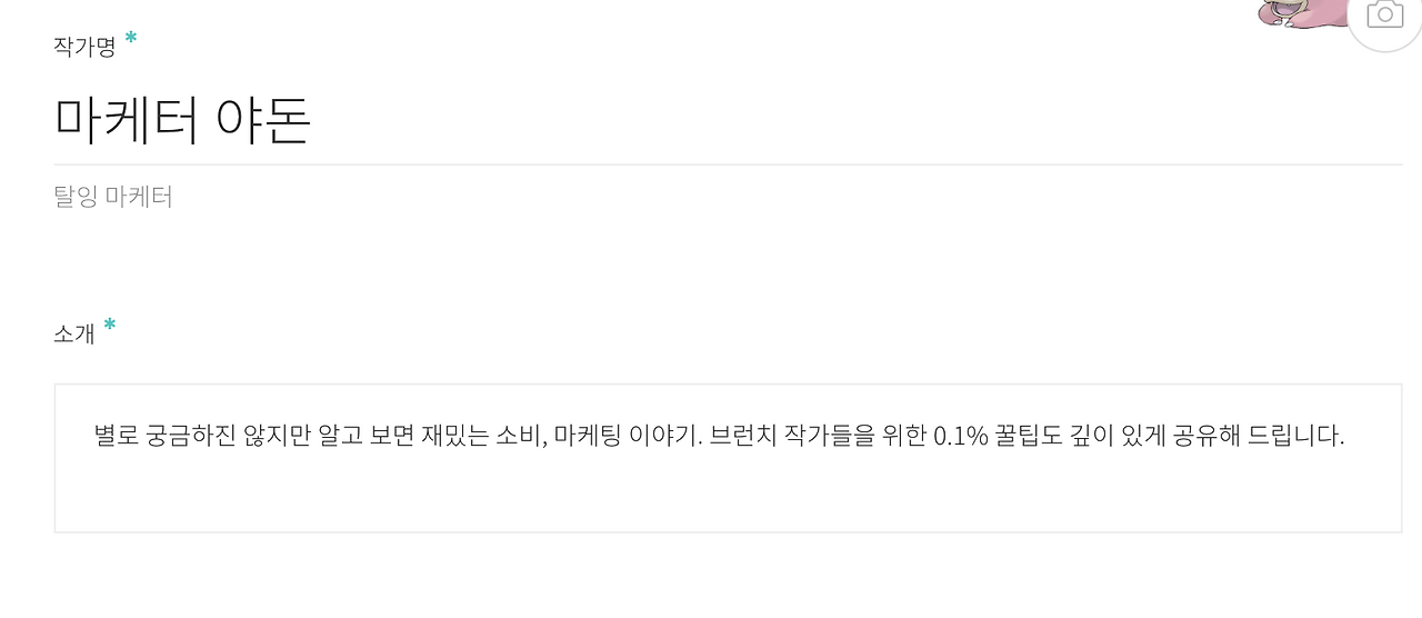 물론 글솜씨가 유려하다면 작가 소개란을 미사여구로 채우면 된다. 하지만 그럴 만한 자신이 없다면 단순하게 내가 어떤 글을 쓰는지 작가소개란에 작성하는 것이 필요하다. 필자 같은 경우는 소비와 마케팅 이야기, 그리고 브런치 작가들을 위한 꿀팁을 공유하는 글을 쓰는데 그러한 내용을 큰 비유법 없이 담백하게 작성했다.