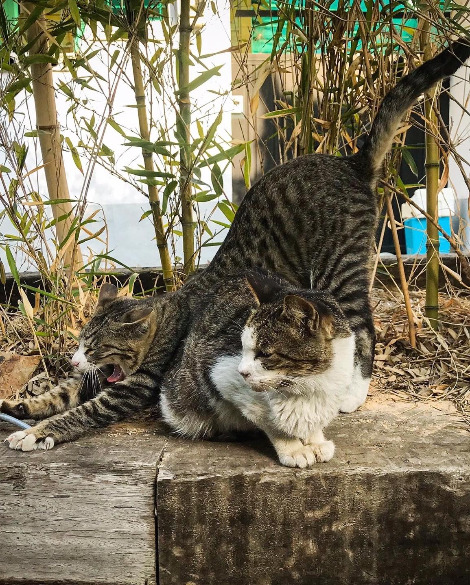 내가 찍은 사진의 이 고양이들은 무늬가 비슷한 걸로 보아 가족인 듯하다. 집 근처 카페에서 살고 있는데, 어미가 새끼를 낳아 쭉 생활한 것처럼 보인다. 사람이 지나가도 눈길 하나 주지 않고 그냥 저렇게 앉아 있는다. 게다가 여중과 여고가 근처에 있다 보니 여학생들을 유혹하는 미끼로 톡톡히 사료값을 해내고 있지 않나 싶다. 이렇게 고양이들은 우리 주변에 자연스럽게 녹아들어 살고 있으며, 한국 사회에서 생존하는 방법을 빠르게 익혀가고 있다.
