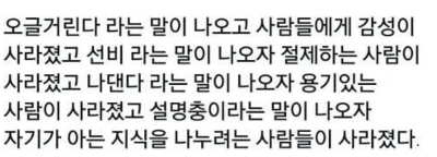 일본에서 '진품', '장인'을 뜻하던 이 단어가 우리나라에서는 정반대의 의미로 전락한 채 쓰인다. 오타쿠를 거쳐 이제는 '눈치 없이 본인이 좋아하는 걸 늘어놓고, 쓸데없이 진지한 사람'을 조롱하는 인터넷 은어가 되었다. 언어는 사유를 담는 도구이며 동시에 사유를 규정하는 틀이다. 조롱의 언어들이 확산되면서 그것이 지칭하는 행위들이 실제로 사라지는 현상을 목격한다. 감성을 '오글거린다'라고 하자 진정성이 사라졌고, 진지함을 '설명충'이라 하자 지식 나눔이 사라졌다.