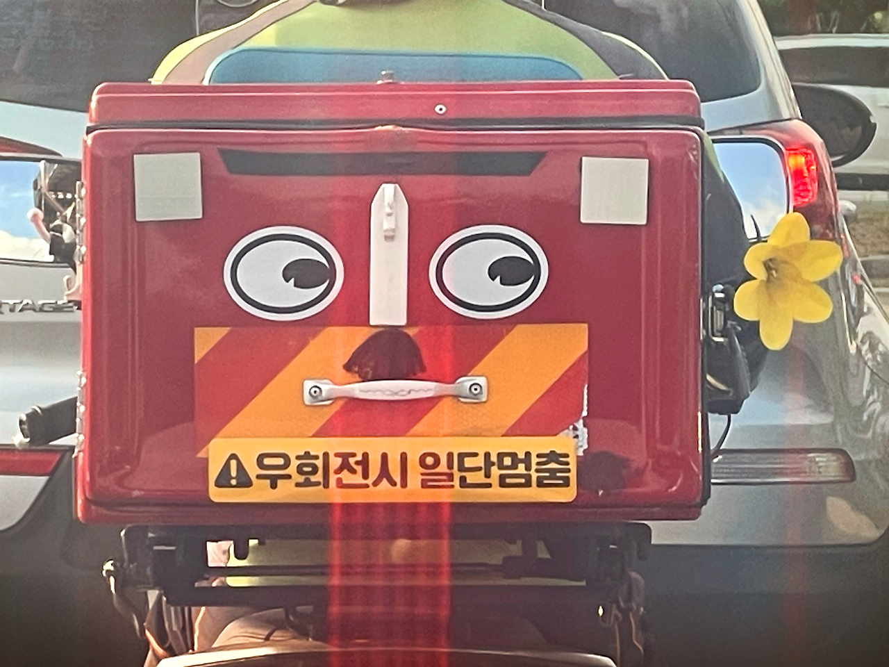 라이더 아저씨와 함께하는 샛노란 귀여움과 귀여운 스티커를 통해 눈코입과 수염까지 만들어내서 보는 사람이 저절로 미소 짓게 만들었다. 누군가에게는 무의미하게 지나갈 수 있는 그 길을 미소 짓게 해주는 것. 어쩌면 아저씨가 바라는 그림이 아니었을까? (물론, 내 생각이지만)