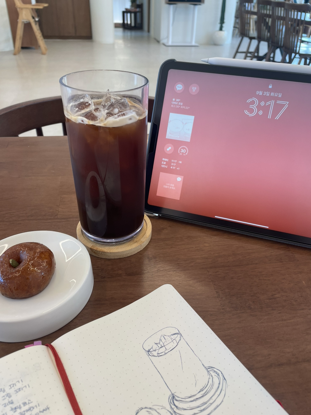오늘은 카페에서 시간을 보내게 된 만큼, 아이패드로 그림을 그려야지 했는데 선택하게 된 건 손그림이다.
