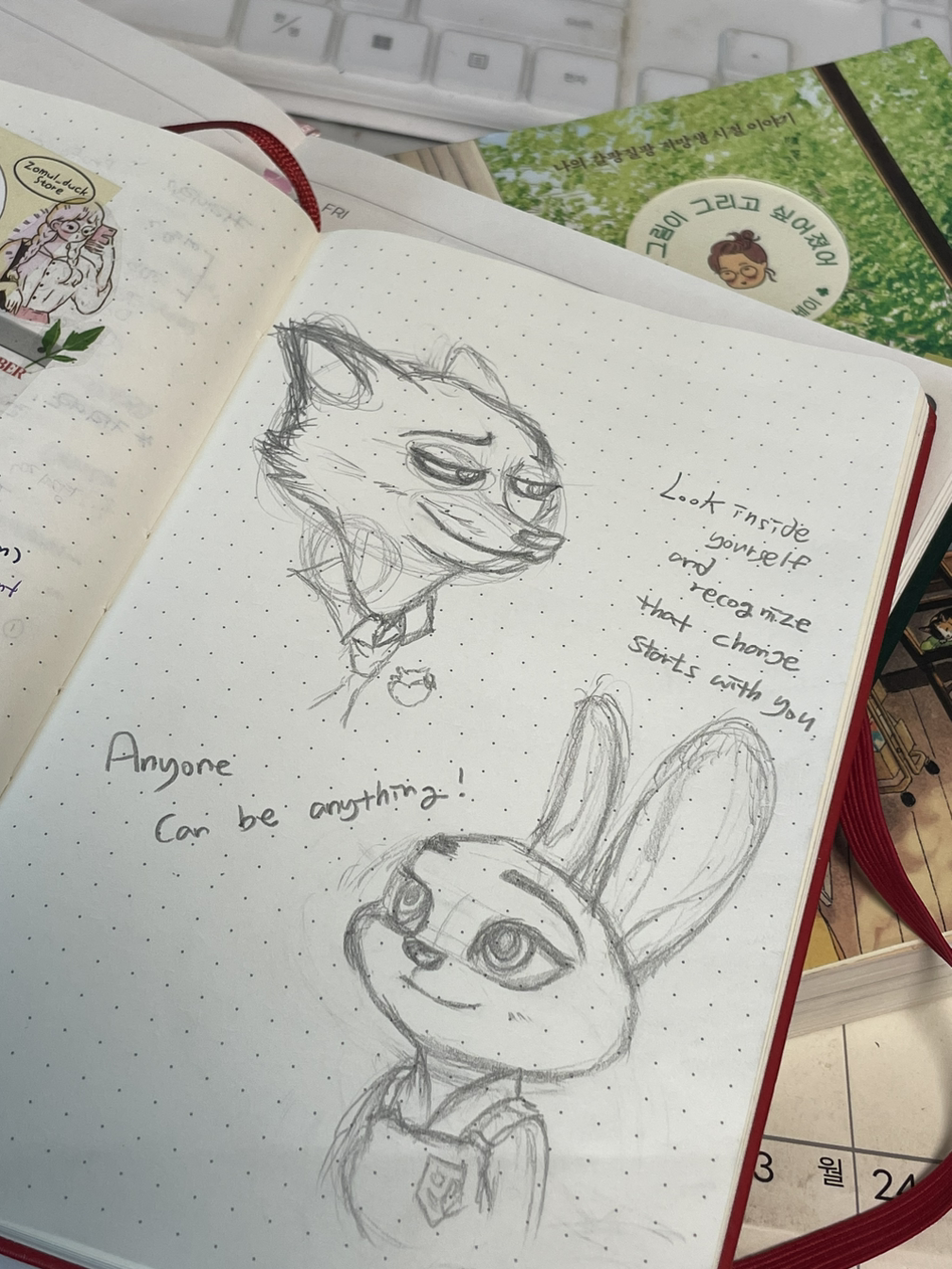 퇴사를 하며 현실을 잠시 내려놓고, 좋아하는 것을 찾기 위해서 그림을 그리기 시작해서 그럴까. 주토피아라는 영화를 킬링타임으로 보내기에는 아쉬웠다. 그래서 내가 표현하고 싶은 대로 주디와 닉을, 영화에서 감명 깊었던 대사들과 함께 다이어리에 담아냈다.