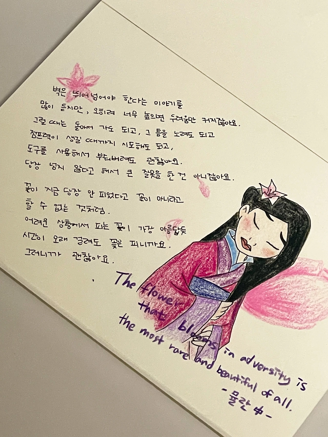 본연의 모습을 억누르고 있던 뮬란에게 위로를 해주는 아버지의 사랑이 담긴 그 대사가 마음을 뭉클하게 만들었는데, 이 대사가 꾹꾹 담은 마음을 전달해 줄 수 있을 것 같았다. 그래서 바로 뮬란을 그리고 한 글자 한 글자에 꾹꾹 마음을 담았다.