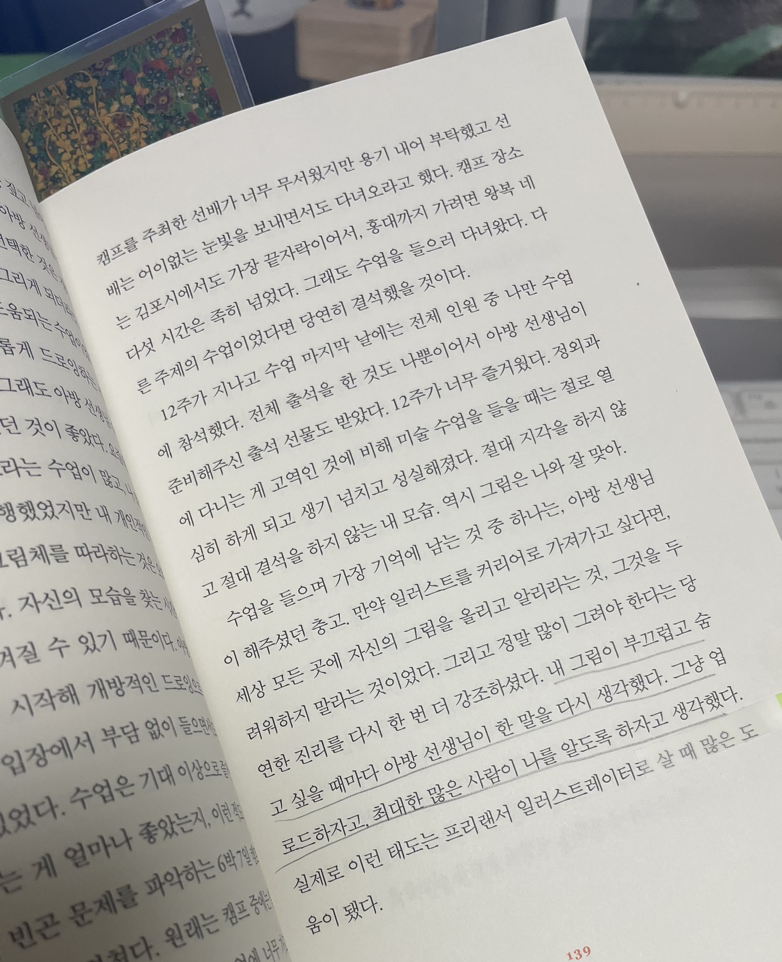 그리고 책상으로 돌아오는 데까지는.. 제법 시간이 걸렸다. 읽어야 할 책이 있어서 다시 앉은 책상에서 책을 읽고 정리를 하던 찰나, 초록색의 표지가 눈을 사로잡았다. 가까이에 두고 천천히 읽고 있었던 책이었는데, 지금 딱 읽어야할 때라는 생각이 들었다. 역시나, 뒷걸음치고 있는 마음을 다시 붙잡아온다.