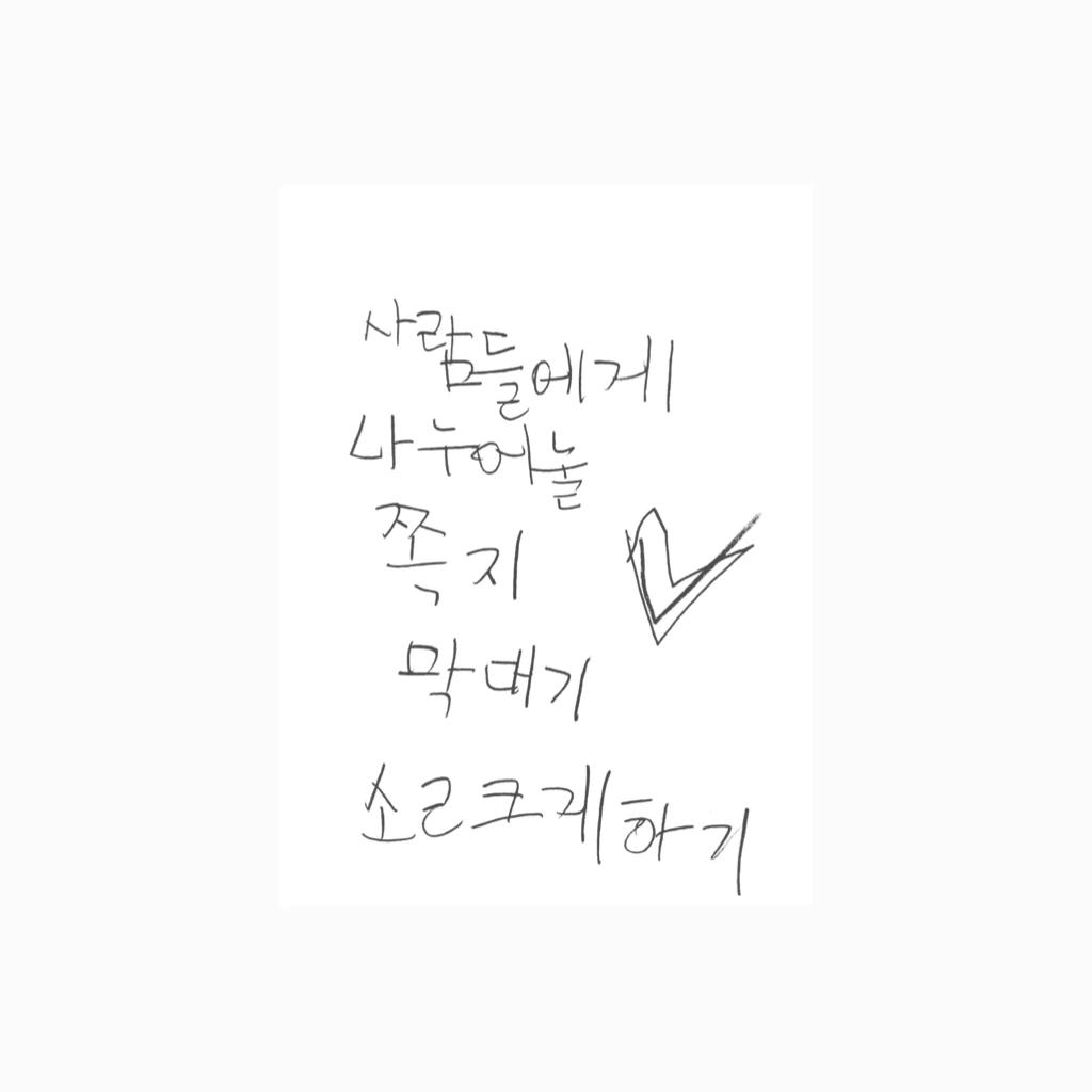 홍보 활동을 하는 각각의 아이들을 관찰해보았습니다. 윤주, 가윤, 은준, 은우 4명의 아이 각각 다른 욕망을 가지고 있어 흥미로웠어요. 본인이 애정 하는 공간을 다른 사람들에게 알려서 많은 사람들이 찾아왔으면 하는 바람(윤주), 카페에 손님이 많이 와 돈을 많이 벌어 작업실이 부자가 되었으면 하는 바람(은준), 홍보를 처음 해봐 기쁘고 지나가는 타인이 자신의 말에 귀 기울여 주는 게 기쁨(은우), 그저 하고 싶음에 흥분!!(가윤) 정은샘과 홍보 활동 지속에 대한 회의를 하다가 아이들과 다 함께 활동을 정리를 해보기로 했어요. 에어컨 옆 원형 테이블에 모여 네 머리를 골똘히 모아 진지하게 회의에 임했는데요. 각자 ‘홍보를 어떻게 하고 싶은지’를 작성했어요. 완성 후에 서로의 제안서(?)를 돌려 읽고 가장 좋다고 생각하는 제안에 투표했어요.
