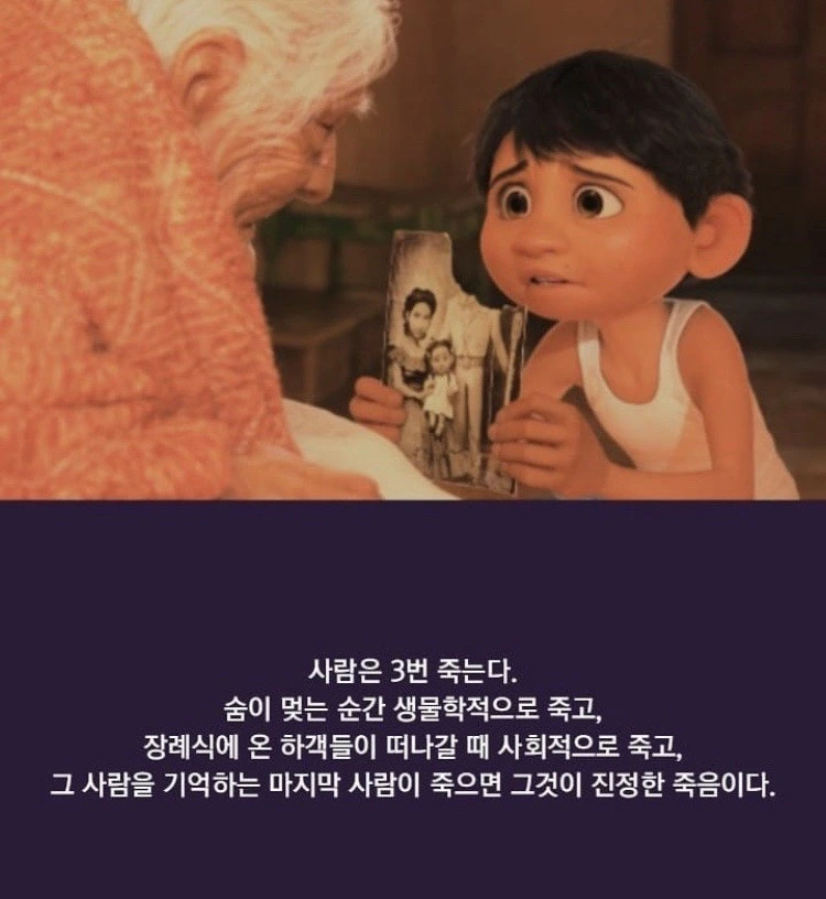 지금 당장 떠오르는 건, 애니메이션 '코코'와 한강 작가의 '희랍어시간'에 나오는 장면, 그리고 병상에서 엄마가 사위에게 건넨 생일 용돈 봉투에 써 내려간 짧은 편지 정도이다.