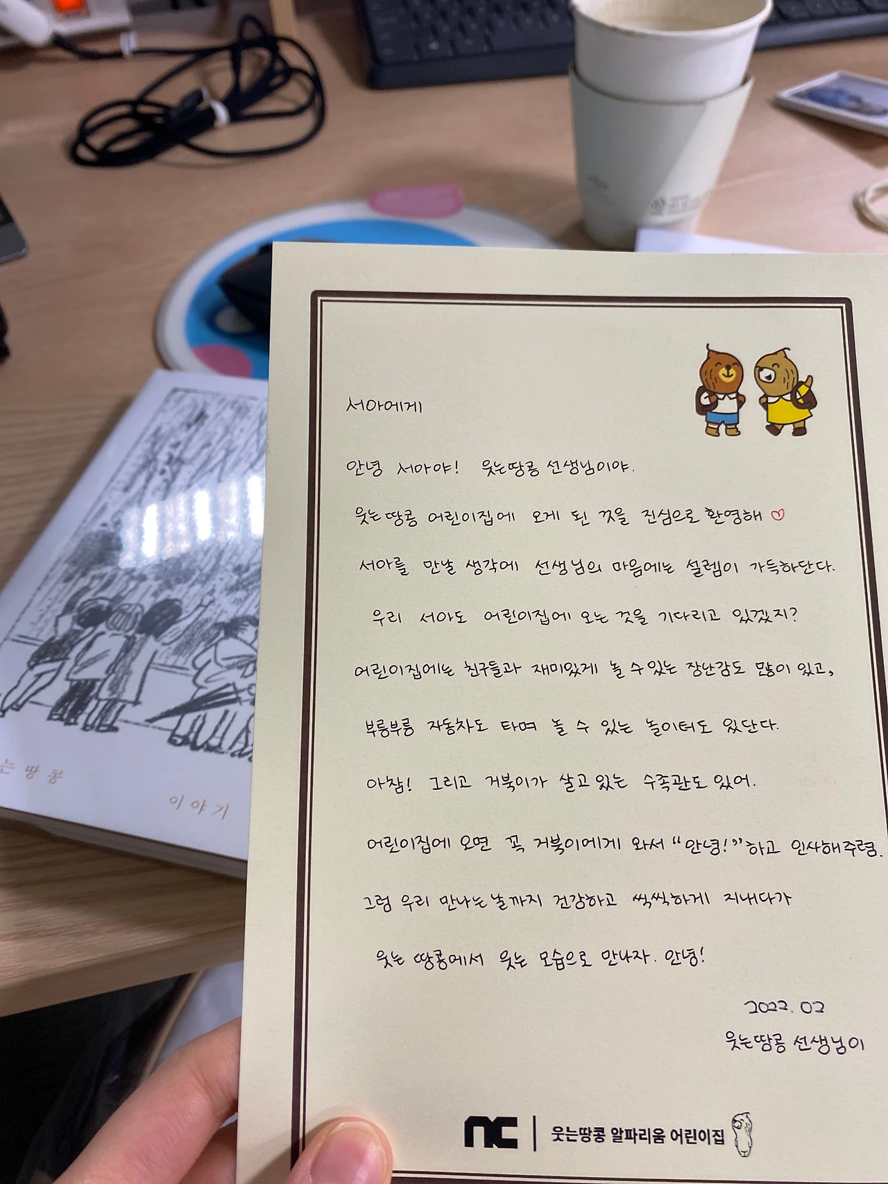 아이가 다니는 어린이집의 이름은 '웃는땅콩' 어린이집이다. 작은 아이들을 '땅콩'이라고 일컫는 귀여운 표현을 생각하며, 그 땅콩 같은 아이들이 키득거리며 늘 웃는 모습이길 바라며 지었다는 이름은 그 캐릭터와 함께 보면 정말 찰떡이다. 이름을 이야기할 때마다 귀여움에 절로 미소 짓게 되는 이름.