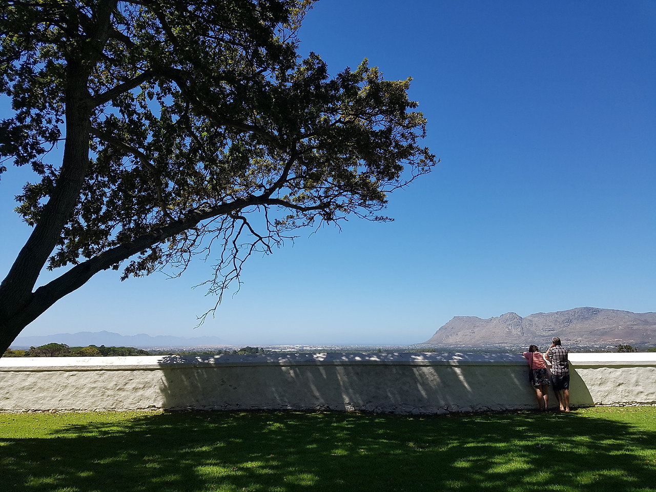 한 바퀴 둘러본 뒤 다음 버스를 타러 내려가는 중이었다. 어느새 맑게 갠 하늘 아래 우뚝 솟은, 와이너리의 역사만큼이나 아주 오래되어 보이는 나무가 시야에 들어왔다. 커다란 나무 아래 자연이 만들어내는 그늘막을 따라 시선을 옮겨가다 보니 수평선을 따라 곧게 뻗은, 와이너리를 감싸는 하얀 벽에 기대어 그 풍경을 바라보고 있는 두 사람이 보였다. 아까 산책로를 거닐 때부터 다정하게 손을 꼭 잡고 내 앞을 걸어가던 노부부였다. 그 고요하고 안온한 순간을 오래 남기고 싶은 마음에 사진기를 꺼내 셔터를 눌렀다. 그리고 그들에게로 발걸음을 향했다.