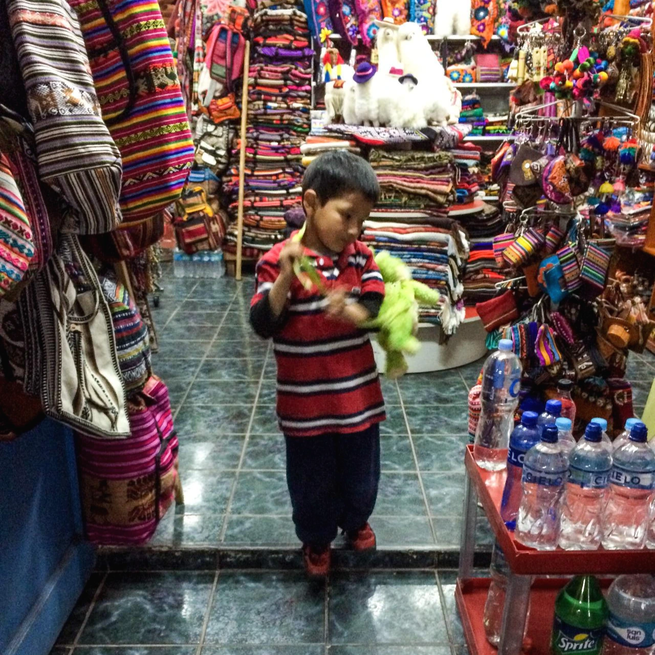숙소를 나와 저녁을 먹으러 나가는 길, 골목 곳곳에 열린 형형색색의 상점들이 눈길을 사로잡았다. 알록달록한 가방과 신발, 마추픽추와 라마가 그려진 상징적인 티셔츠, 아기자기한 소품들과 알파카의 털로 만들었다는 판초도 있다. 한 가게에 들어가 친구들과 구경을 하고 있는데, 주인아주머니의 아들이라는 요정같이 생긴 꼬마가 와서는 나를 졸졸 따라다닌다.