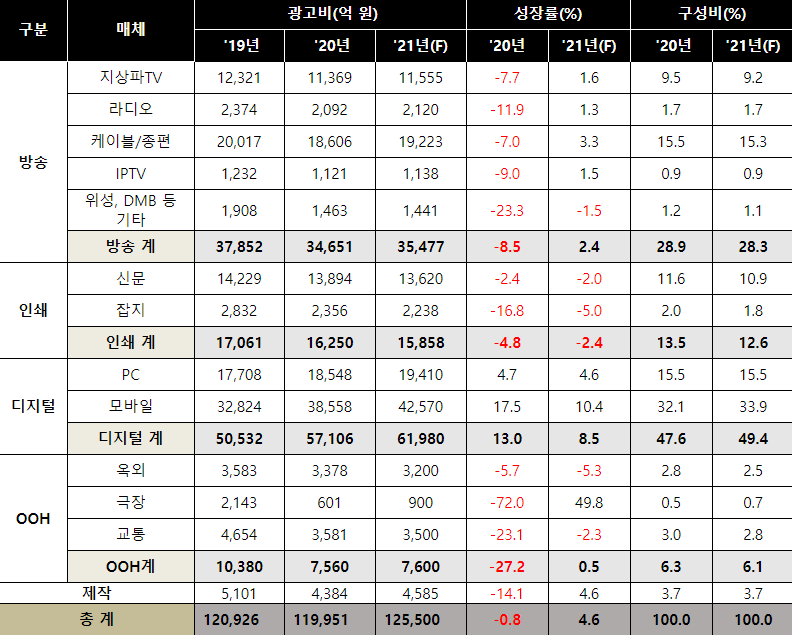 괜찮은 내용들이 많습니다. 업종별 광고비 현황이나 PC/모바일 세부광고 유형별 광고비 자료들을 볼 수 있습니다. 최근 10년 치 광고비 통계를 그래프로 확인할 수도 있죠. 하지만 ‘최소한의 광고 효율을 위한 광고비’ 질문에 대해 충분한 답변은 안 되는 것 같아요.