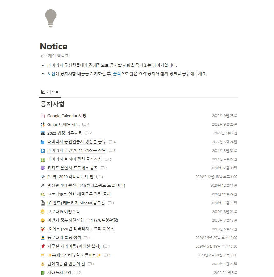 래버리지는 고객사 관리부터 내부 업무까지 모든 것들을 노션을 통해 정리하고 기록해둔다. 일반적인 문서 하나까지도 전부 노션에 정리를 해둔다. 처음에는 왜 이렇게 작은 것 하나까지 다 정리를 해둬야 하는지 그 중요성에 대해서 알지 못했다. 그러나 래버리지에서 일을 하면 할수록 정리의 중요성에 대해서 몸소 느낄 수 있었다.