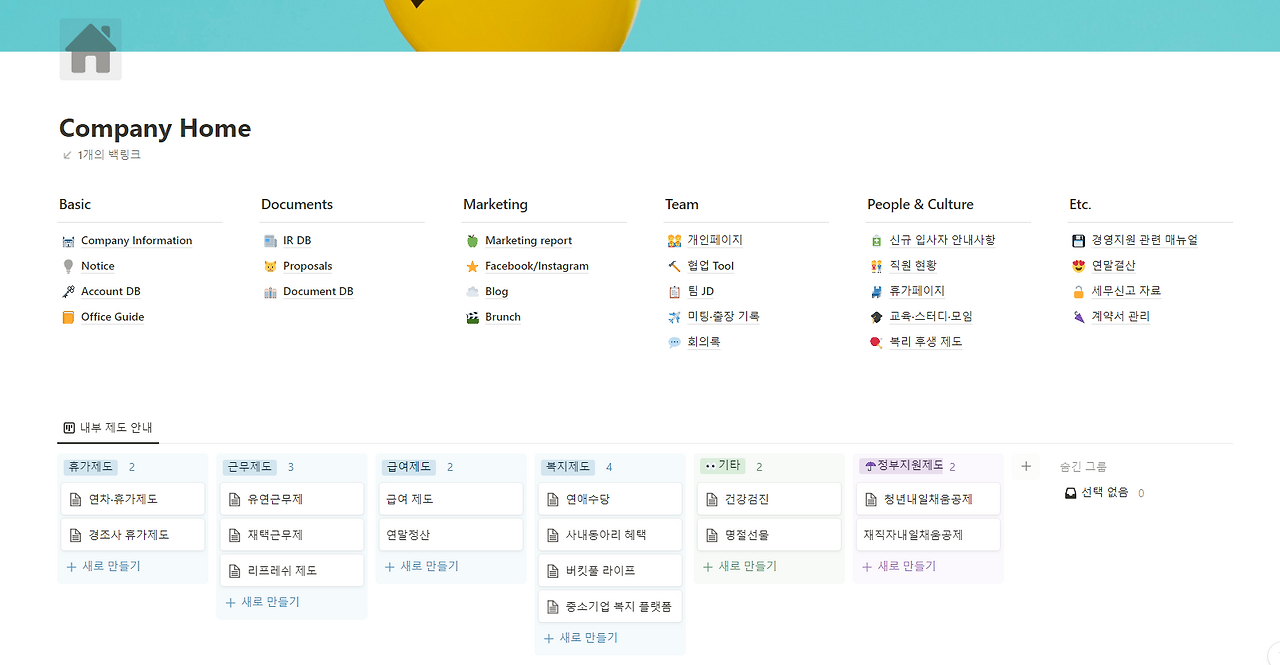 래버리지의 노션 정리에 대해서 조금만 더 맛보기로 보여드리자면, 팀원들이 사용한 법인카드 내역, 매출 현황, 회사 복지제도, 미팅록, 회의록 등 회사 내부적인 데이터들도 전부 노션을 통해 정리를 하고 있다. 노션이라는 툴 자체의 UI/UX가 다른 업무툴에 비해 직관적이고 깔끔한 것도 수월한 정리를 하는 데 있어 한몫을 하는 것 같다. 깔끔하게 정리된 회사 노션 페이지를 보고 있자니 어지럽던 내 마음도 깔끔하게 정리가 되는 것 같다.