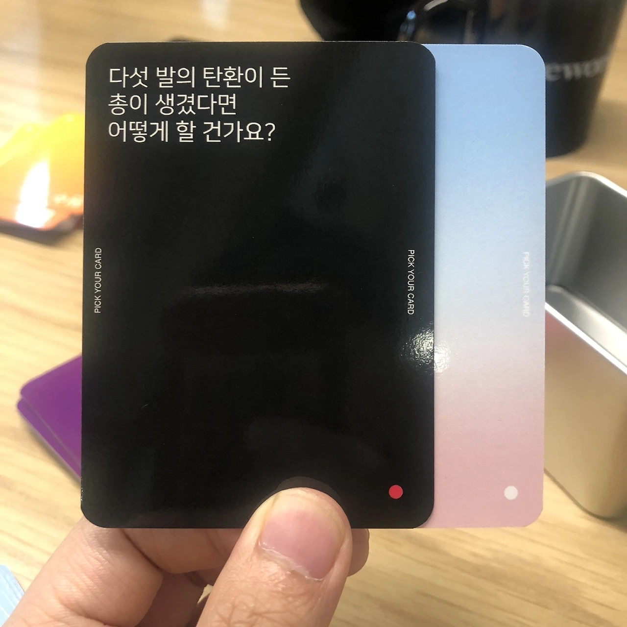 최근 대화카드라는 것을 접하였다. 그리고 친한 지인 분께서 PICK YOUR CARD라는 대화카드를 만들었고, (현재 펀딩 진행 중) 테스터가 될 수 있는 기회를 주셨으며 위 이미지는 만드신 대화카드 중 일부이다. 카드에서는 여러 가지 씹을꺼리들을 던져 주는데 최근 나는 이 아이템을 사용하며 무거운 분위기를 조금이나마 가볍게 만들고 있는 중이다. (개인적으로 술을 활용한 분위기 개선보다 훨씬 탁월하다고 생각한다)