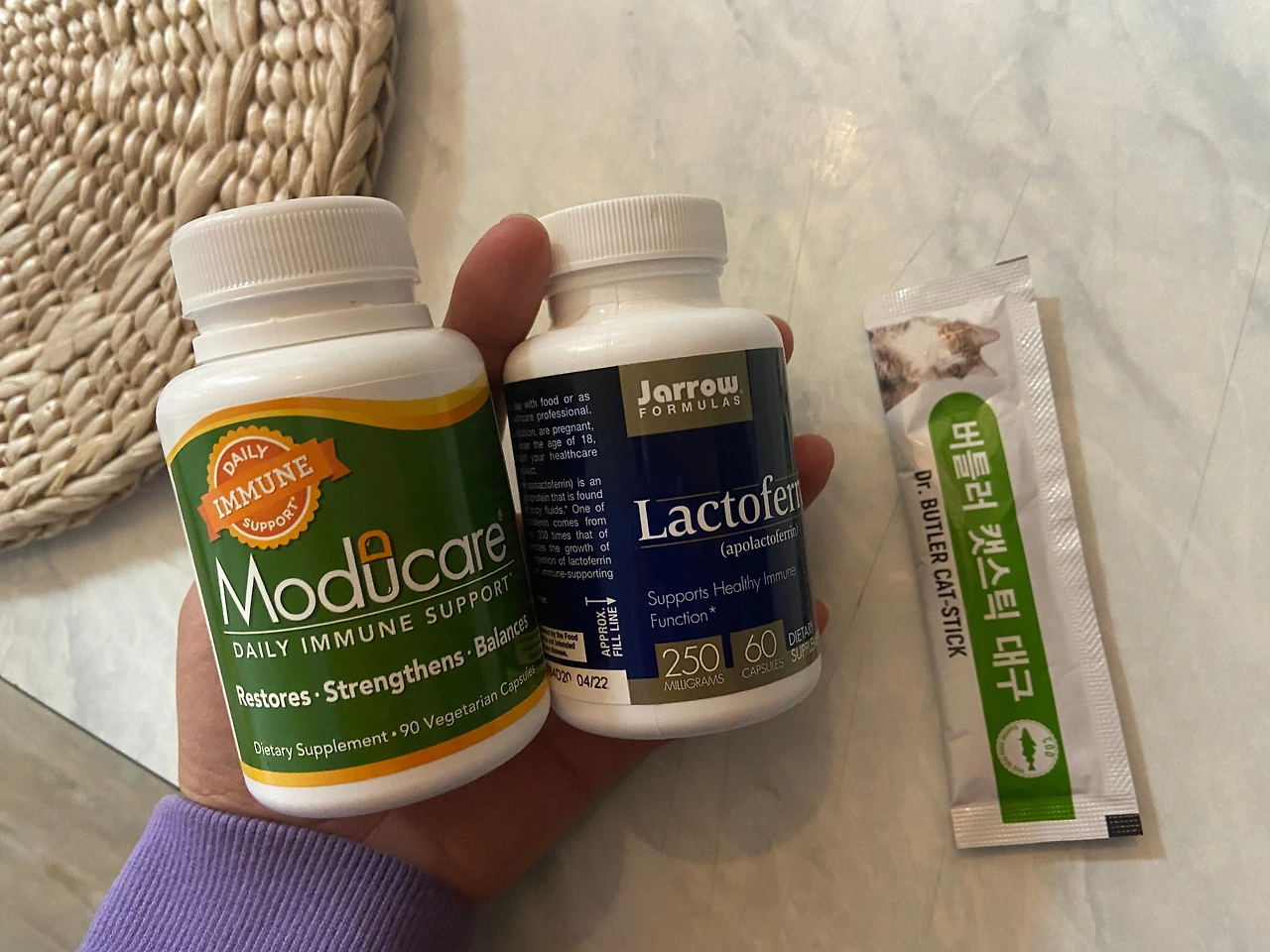 <요즘 라운이가 먹고 있는 영양제이다. 모듀케어, 락토페닌, 모두 사람이 먹어도 되는 면역을 위한 영양제이다. 츄르 같은 간식에 섞어서 준다. 그 외에 다른 영양제 4종 정도를 iherb에서 추가 구매했다. 그건 염증을 잡아주고 약 끼리 잘 흡수 되라고 시킨 영양제이다. 구내염은 사람으로 치면 아토피 같은 질환이다. 자기 면역의 문제를 스스로가 해결해야한다. 병원에서 주는 구내염약은 원천적으로 치료를 하는 약이 아니라 항생제와 스테로이드이므로 그때 잠깐 괜찮게만 만들어주는 효과만 줄뿐이라 가급적 쓰지 않는 것이 좋다. 그런데 아이가 너무 아파서 밥을 못먹거나 고통스러워 하면서 침을 흘리는 걸 보면 삶의 질이 너무 떨어져 이렇게까지 스테로이드를 끊어야하나 싶어 다시 조금씩 주었다. 지금은 병원에서 처방받은 약(항생제+스테로이드)를 아이의 컨디션을 보면서 조금 주고 영양제 (락토페닌+모듀케어)를 많이 많이 주려하고 있다. 약 때문인지 안정감을 찾아서 인지 모르겠지만 라운이는 잘 먹고 잘 잔다. >