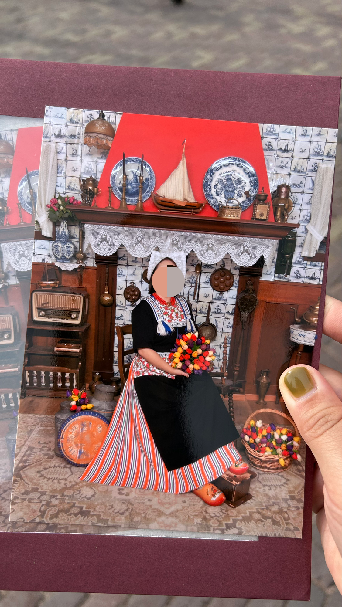 기분 좋게 사진 찍으러 왔다고 말을 하고 가게 2층으로 올라갔다. 자동으로 착착 진행됐다. 정신을 차리니 나는 전통의상을 풀로 갖춰 입고 옛날 배경 앞에서 튤립을 안고 있는 내가 있었다.