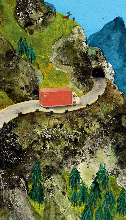 이름 없는 배달부 아저씨는 이름 없는 산을 매일 넘어갑니다. 트럭을 몰고 가는 아저씨에게 산은 그저 지나쳐가는 익숙한 풍경입니다. 아저씨에게 중요한 건 실수 없이 물건을 잘 배달해주는 일이니까요. 차 안에 갇혀 눈에 띄지 않고, 차 안에서만 밖을 내다볼 수 있는 아저씨의 일상이 조금은 외로워 보입니다.