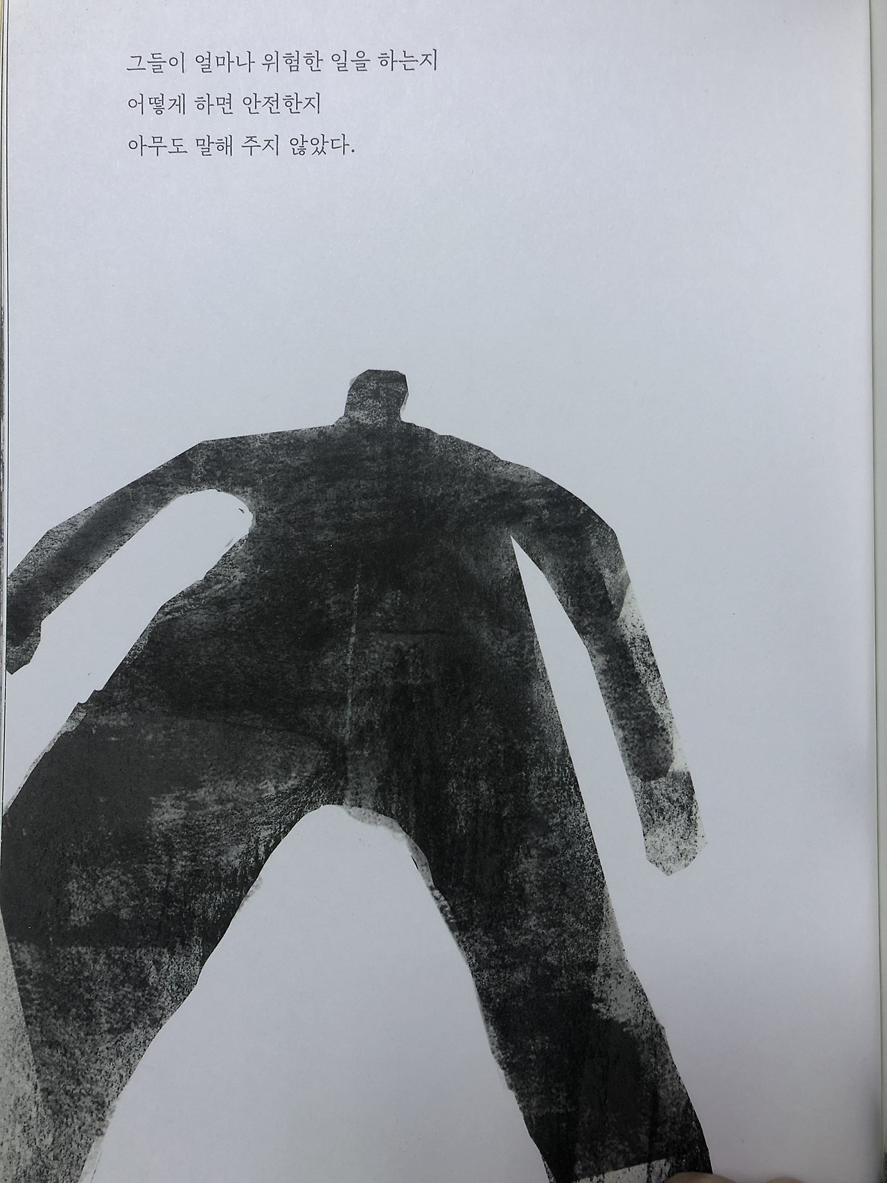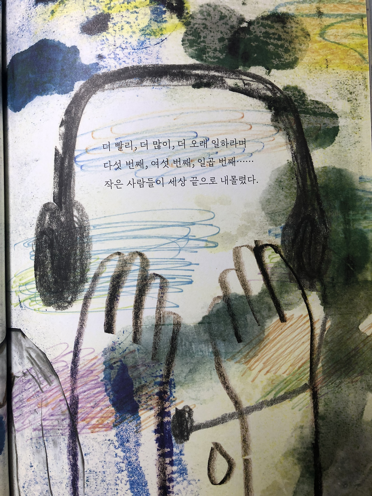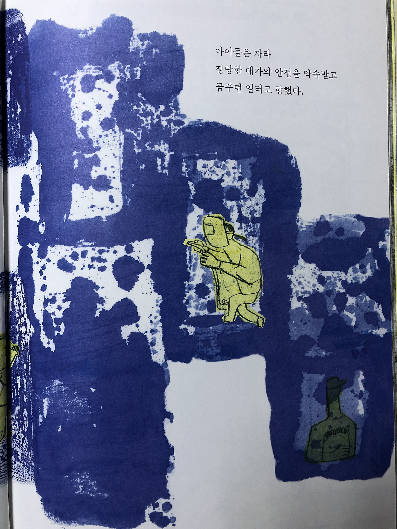 '돌아오지 못한 아이들'은 청소년 현장 실습 노동자의 반복된 죽음을 다루고 있는 그림책입니다. 정당한 대가와 안전을 약속받았지만 제대로 보호받지 못하고 정당한 대가도 받지 못한 채 아이들은 작은 사람으로 살아가게 됩니다. 보이지 않는 무언가를 들이마시며 쓰러져 간 사람, 열리지 않는 문 앞에서 무너진 사람, 차가운 길과 거친 소음 속에서 쓰러져 간 사람, 그렇게 작은 사람들은 세상 끝으로 내몰립니다. 아무도 작은 사람들에게 어떻게 하면 안전한지 말해 주지 않았습니다.