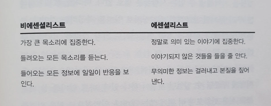 에션셜리스트는 예리한 관찰자 혹은 청취자다. 모든 정보를 전부 받아들일 수 없다는 것을 알고 있다. 겉으로 드러난 사실뿐만 아니라 숨어 있는 뜻도 잘 파악한다. 물론 비에센셜리스트도 듣긴 한다. 듣는 동시에 무언가를 말하기 위해 준비한다. 중요하지 않은 것과 비논리적인 것에 관심을 보인다. 상대방이 전달하는 메시지를 잘못 받아들인다. 상대방 이야기에 반응을 보이는 것에 신경 쓰다 보니 중요한 것을 놓치고 의미 없는 것을 추구한다.