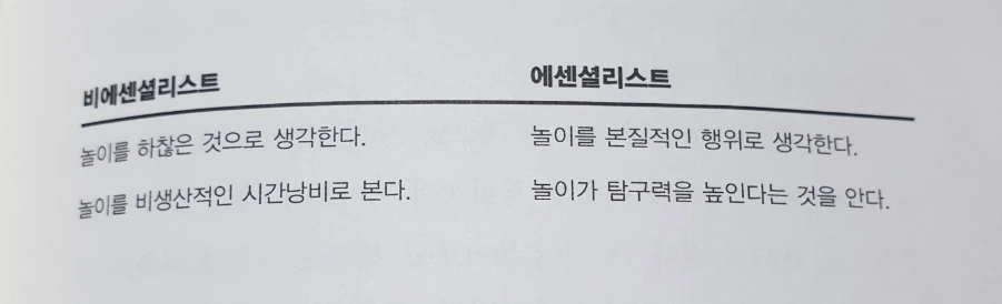놀이는 에센셜리스트가 되기 위한 수단으로 의미가 크지만, 그 자체로도 중요한 의미를 지닌다. 더 이상 놀이를 부정적으로만 생각해서는 안 된다. 급격히 변하고 있는 시대에 놀이는 우리에게 꼭 필요한 부분이다.