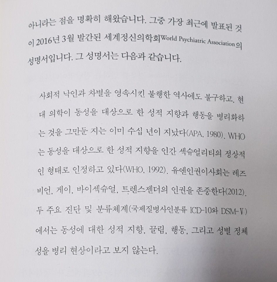성소수자는 원인을 알 수 없는 질병에 걸린 것도, 정신병에 걸린 것도 아니다. 미국 정신의학회, WHO(세계 보건기구), 권위 있는 단체들은 자체적으로 성명서나 보고서를 수차례 발표했으며, 성소수자는 질병이 아니라는 사실을 명확히 밝혔다.
