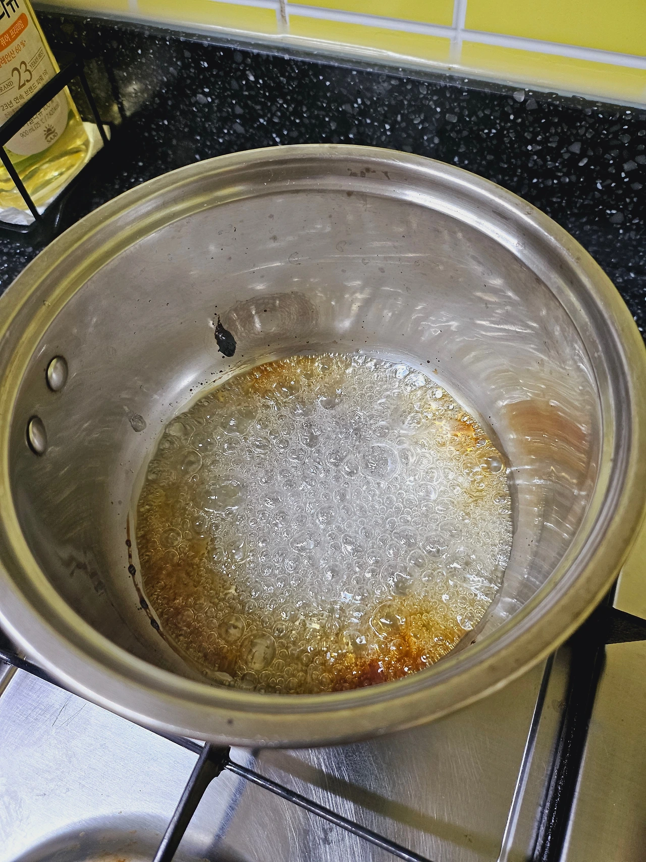 1대 2의 비율로 설탕과 물을 넣고 끓이기 시작했다. 이때 젓지 않고 보글보글 끓이는 것이 중요하다. 얼마나 끓었을까. 하얗던 설탕이 캐러멜향을 풍기며 조금씩 갈색을 띠고 있을 때였다.