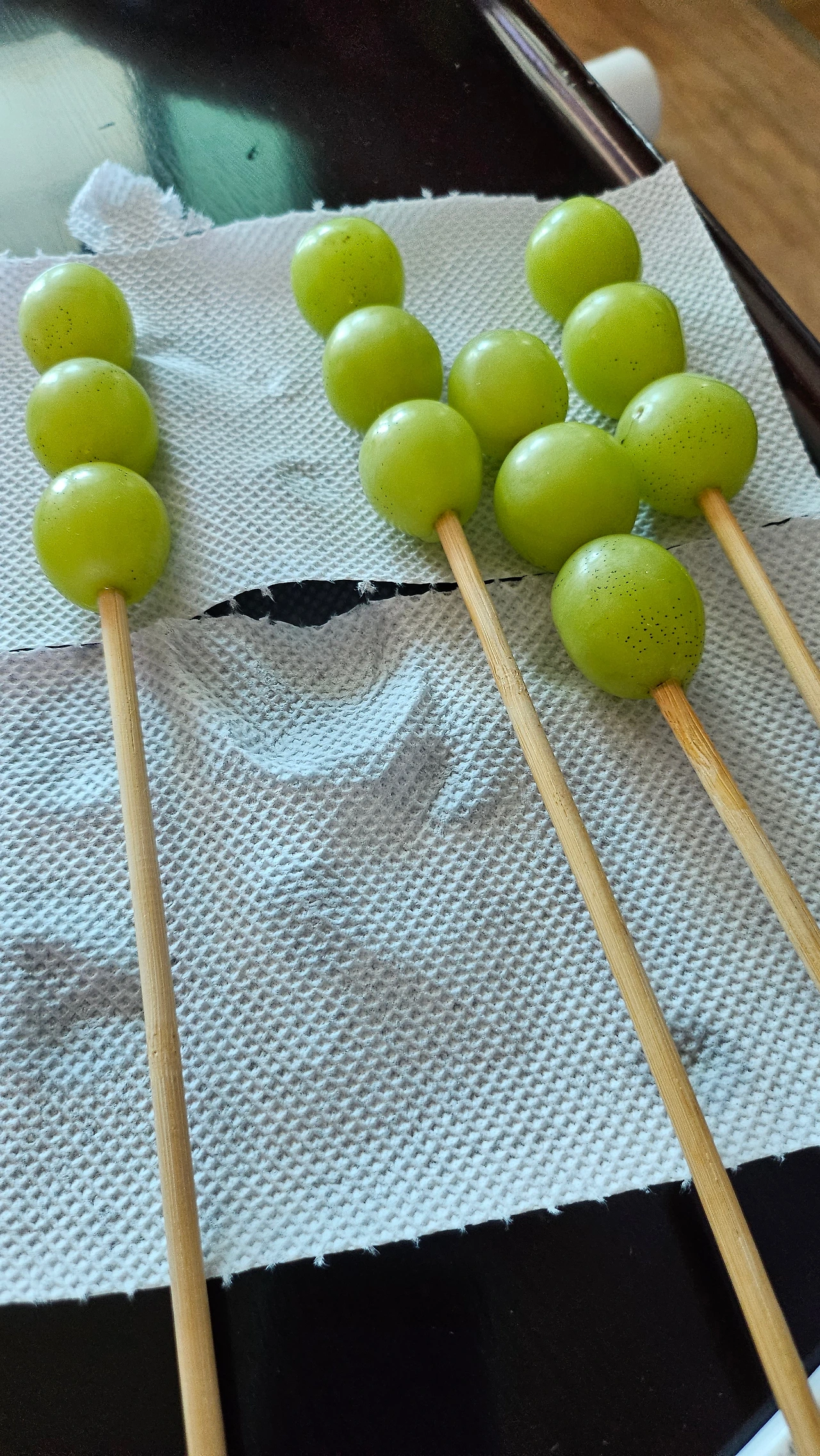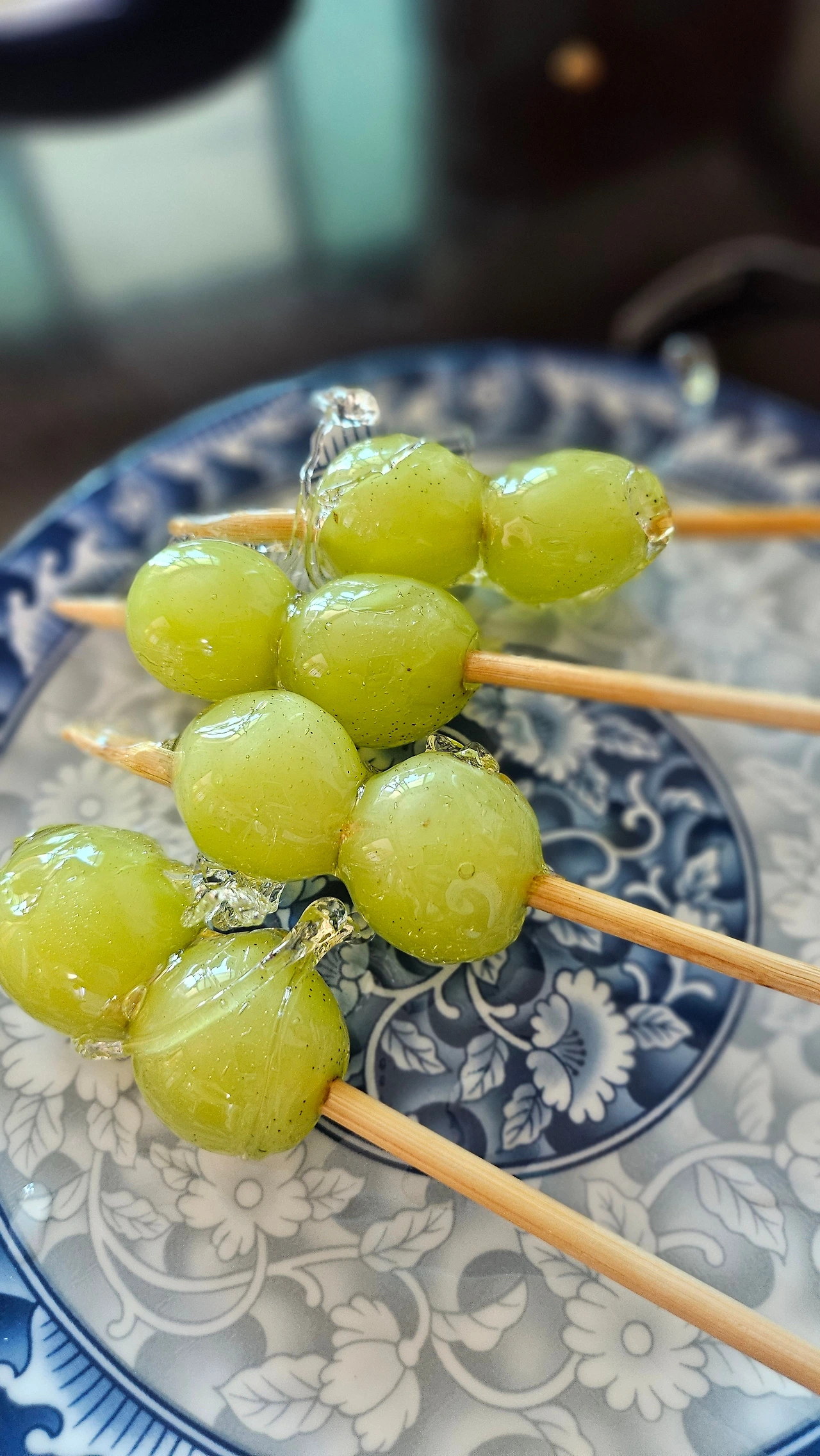 버리기 아까우니 어쨌든 이어 나가야 했다. 뜨거운 냄비에 갈색 빛이 도는 설탕물 속에 줄줄이 꽂은 샤인머스켓 꼬치를 넣고 코팅이 균일하게 발리기를 바라며 조심스럽게 빙글빙글 돌렸다. 탁탁 설탕물을 잠시 털고 빠른 냉각을 위해 샤인머스켓 꼬치를 얼음물에 담갔다. 이러면 반질반질하게 코팅된 설탕이 투명하게 굳어 탕후루가 완성되어야 하는데... 뚝... 뚝... 뚝... 굳지 않은 설탕물이 덜 잠근 수도꼭지의 물처럼 흘러내리고 있었다.