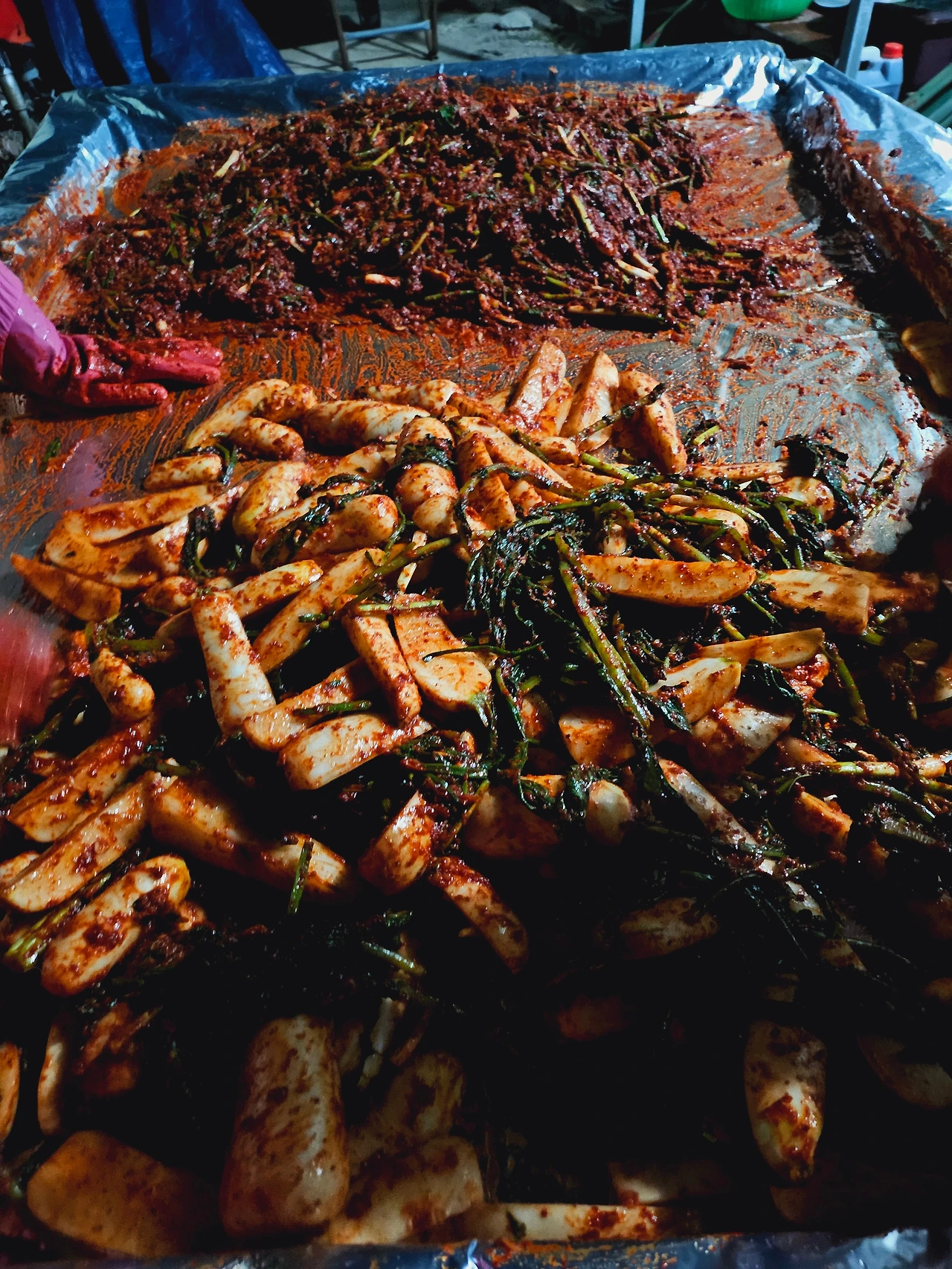 마늘을 믹서기에 갈고 나니 알타리 김치를 담그기 위한 준비는 모두 끝났다. 마당에 있는 평상에 대형 비닐을 깔고 고춧가루를 부었다. 액젓과 간 마늘, 쪽파, 갓, 새우젓, 매실액 등을 넣고 버무려 양념을 만든다. 색이 분명 빨갛게 고운 것 같은데, 어두운 시골에서 야외 벽등 하나에 의지해 김치 양념을 만들자니 알 길이 없었다.
