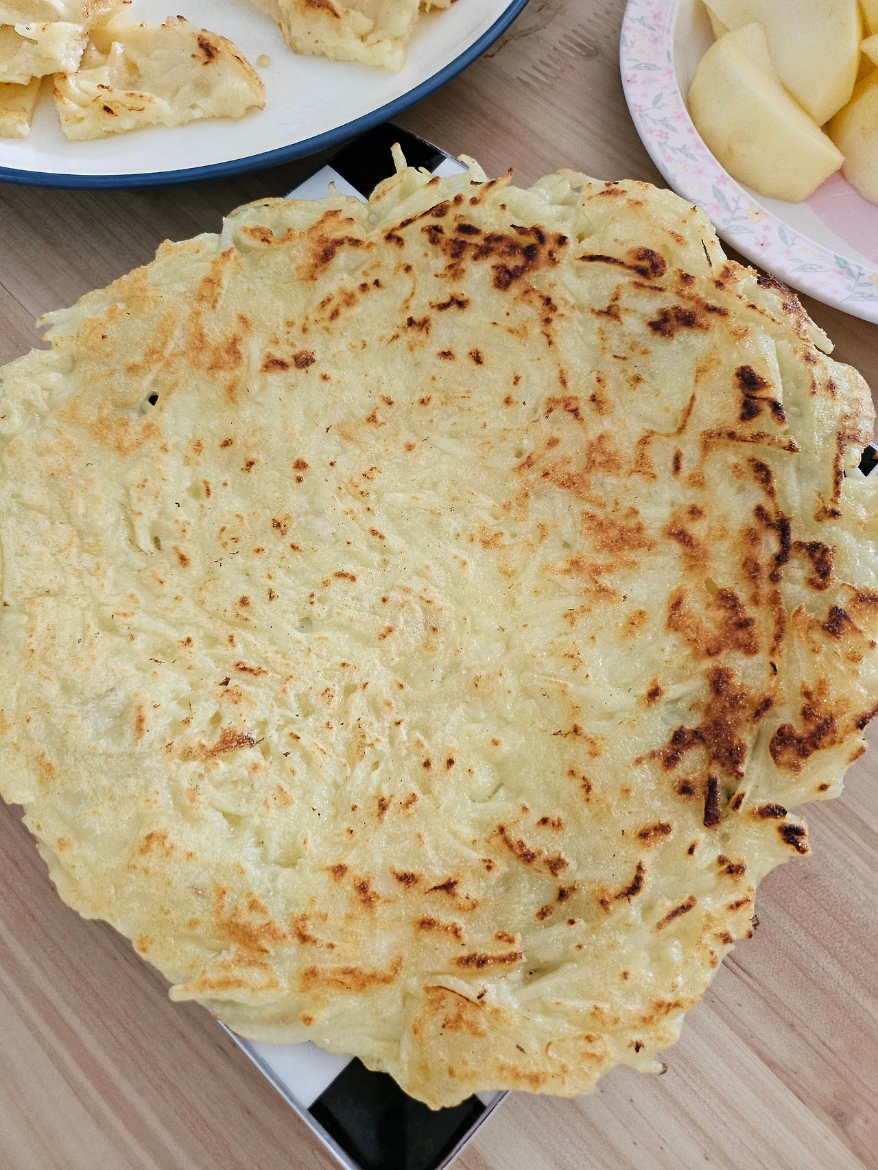 무엇보다 감자전의 기억이 오래가는 건 큰 아이의 반응 때문이었다. 평소 고기를 좋아하는 딸은 야채 종류는 잘 먹으려 하지 않는다. 감자전은 그나마 감자튀김과 비슷한 맛일까 싶어 아이의 반응이 궁금했다. 그런데... 세상에 감자전을 추가하고 또 추가해서 먹는 것이 아닌가. 심지어 친정 엄마가 남겨 놓은 반죽이 있었는데 다음 날에도 해달라고 요청을 했다. 돈가스와 감자전 중 감자전 만을 공략하는 딸을 보고 놀라지 않을 수가 없었다.