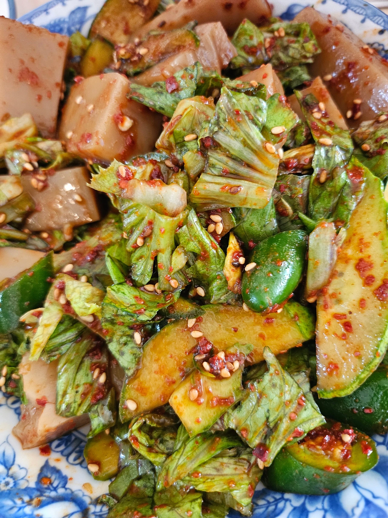 엄마는 안 되는 것이 없다. 집에서 따오신 오이와 상추를 썰어 간장, 매실액, 고춧가루, 참깨를 넣고 버무린 뒤 씻은 도토리 묵을 넣고 묵이 다치지 않게 달래듯 버무려 뚝딱 무침을 완성하였다.