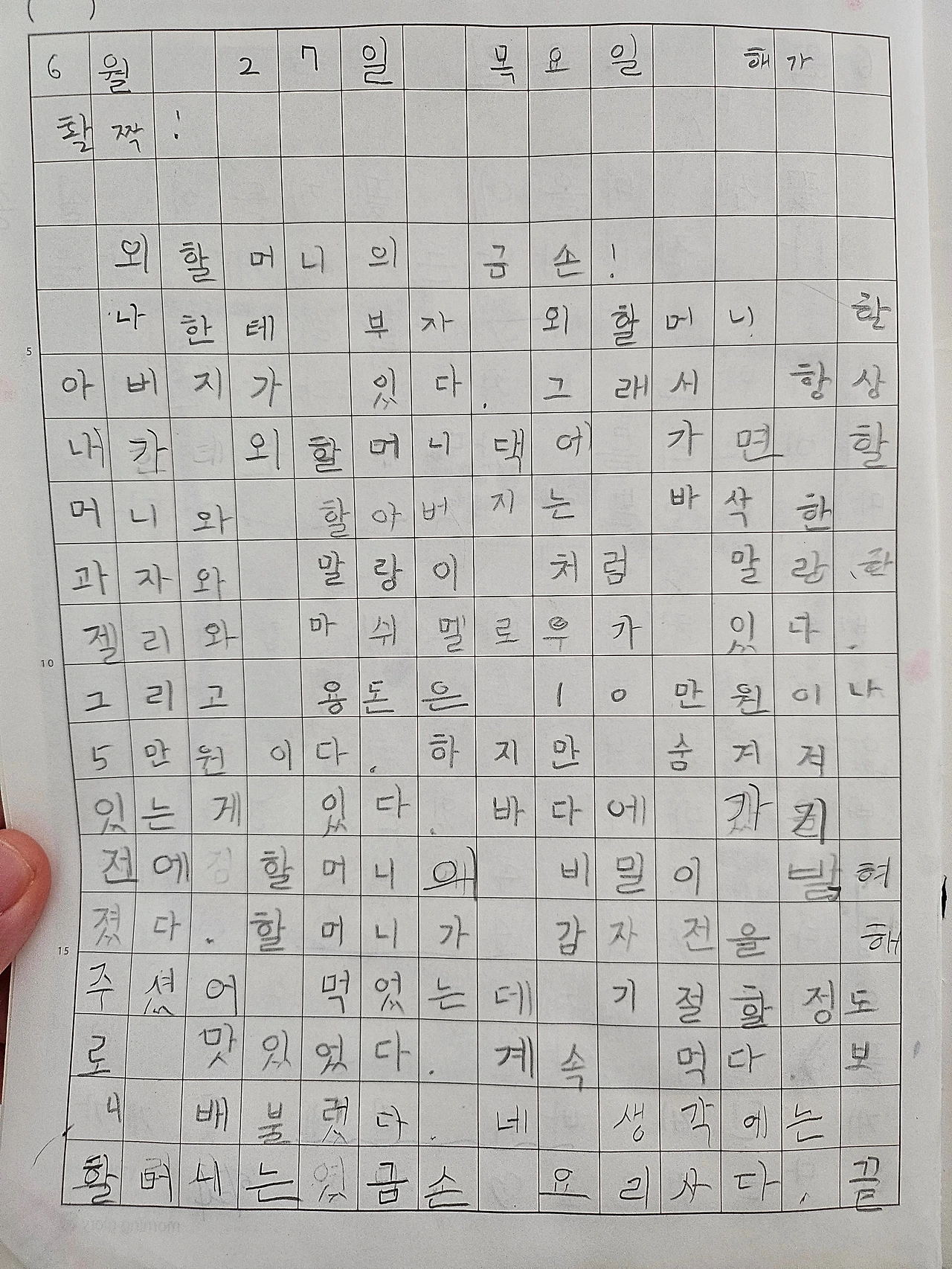 딸은 외할머니의 금손이라 제목으로 일기를 썼다. 기절할 정도로 맛있었다는 표현이 나올만큼 할머니의 요리가 좋았나보다. 엄마의 감자전은 10년 20년이 지난 후에도 딸의 일기장에 기록되어 비밀을 간직한 할머니의 금손으로 기억될 것이다.